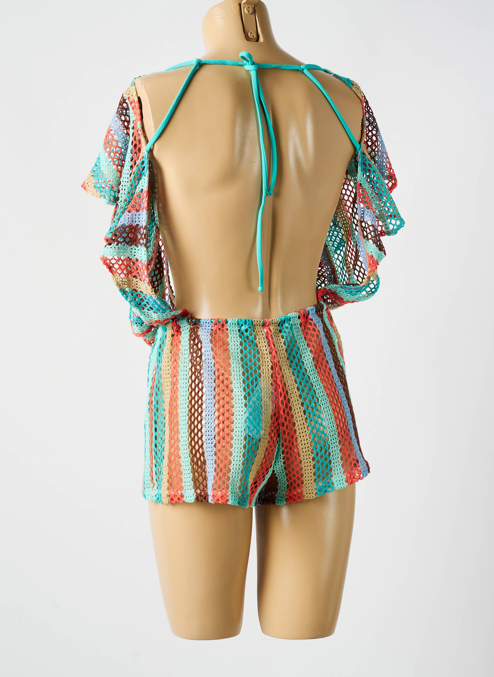 Comme une invitation à danser sous le soleil, ce combishort LULI FAMA mêle audace et légèreté avec ses rayures multicolores aux teintes chaudes et marines, qui illuminent la silhouette grâce à un décolleté plongeant souligné par un tombé fluide et des manches larges et aériennes, sublimant un volume décontracté et élégant à la fois.