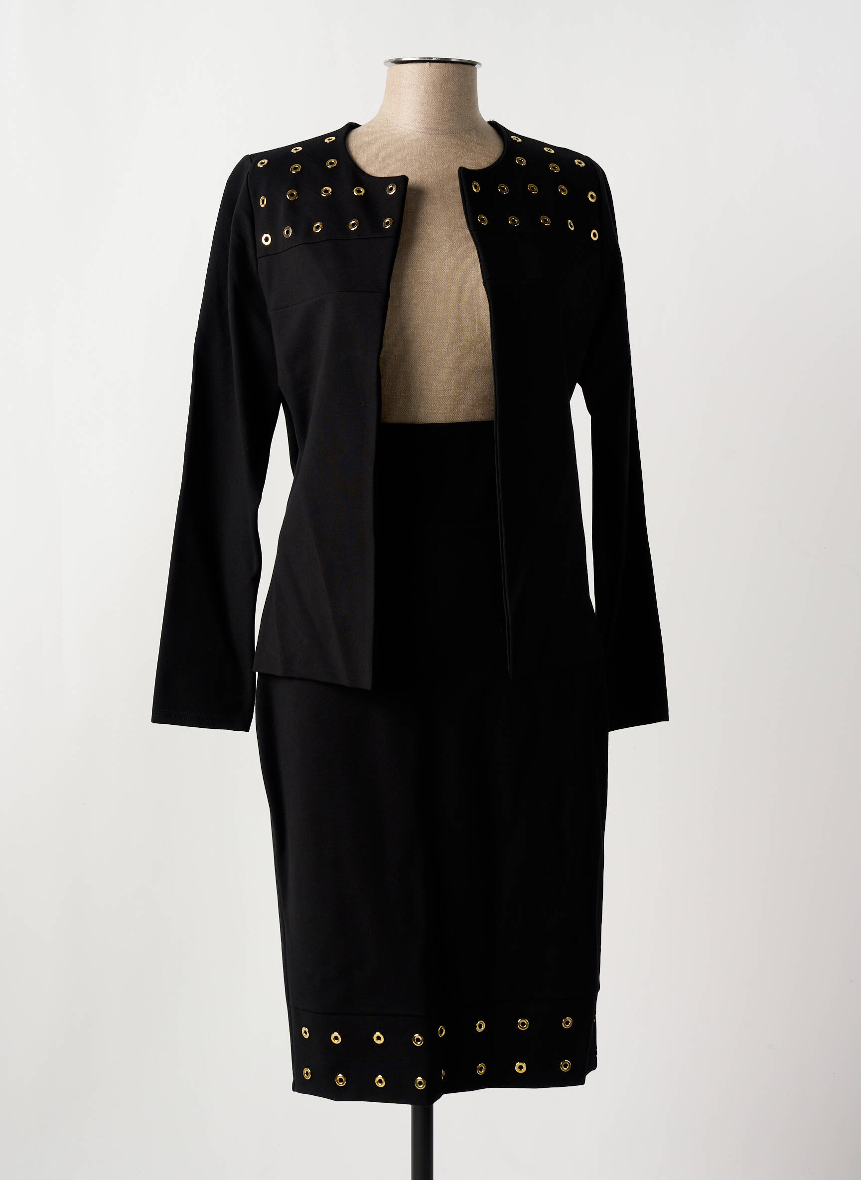 Saisissez l’opportunité de vous offrir un ensemble jupe femme de la marque NANA BAILA à prix tout doux, parfait pour allier élégance et économies. Ce modèle associe une veste longue noire au tomber droit, rehaussée de détails œillets dorés qui apportent une touche contemporaine et sophistiquée, à une jupe assortie longueur genou, également ornée d’œillets métalliques pour un rappel chic et tendance. Cet ensemble polyvalent s’adapte aisément à vos journées au bureau comme à vos soirées, tout en vous offrant le plaisir de porter une pièce de marque sans vous ruiner.