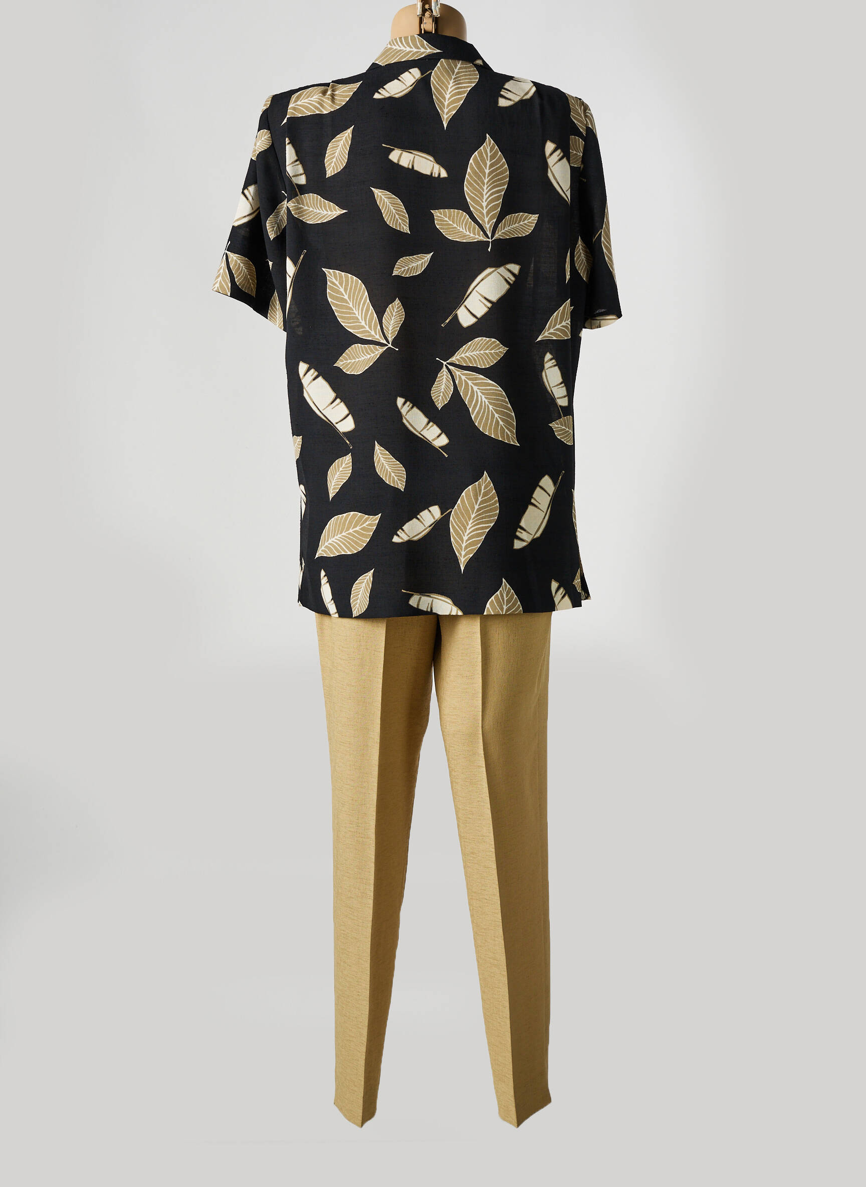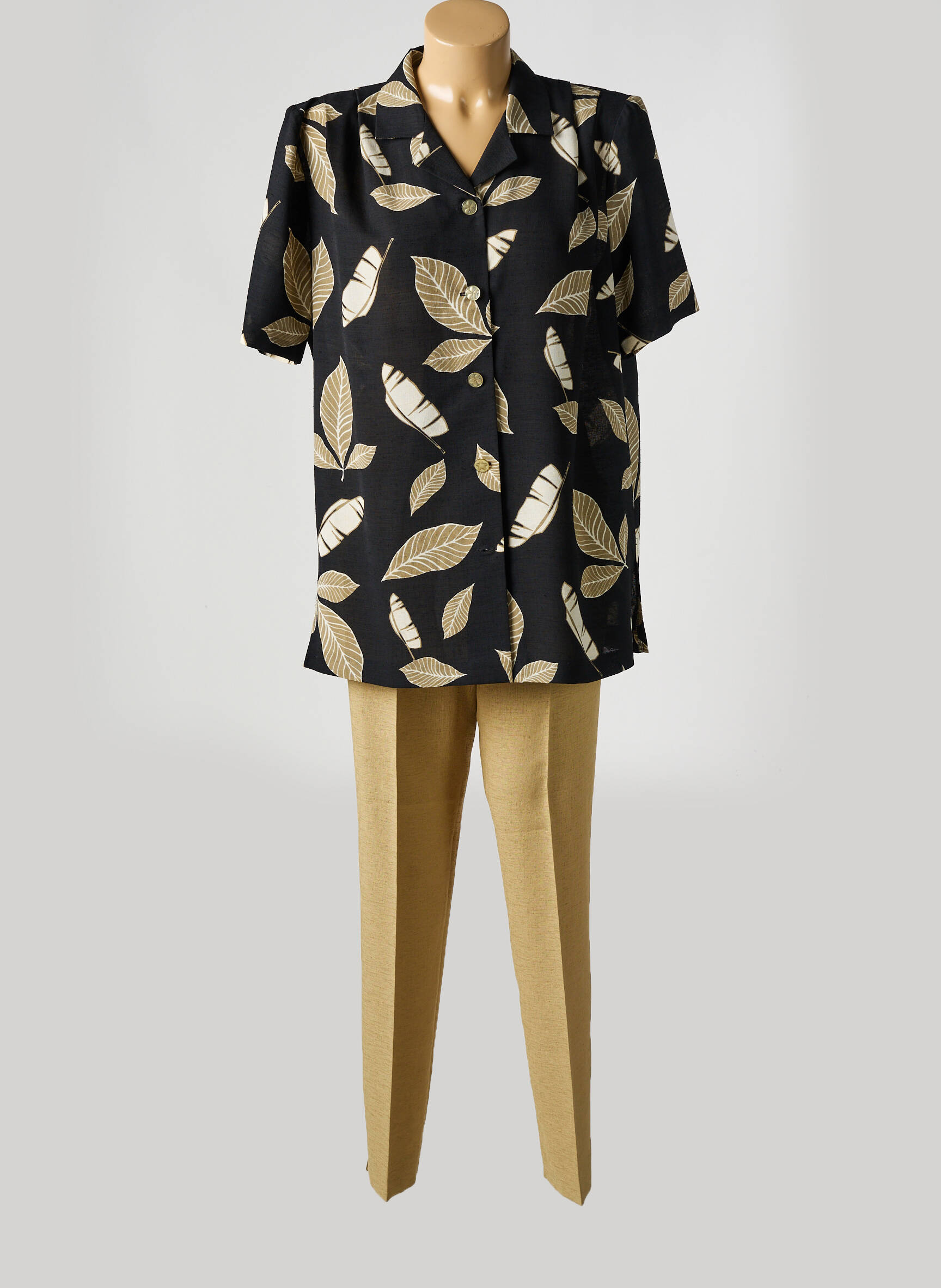 Profitez d’un bon plan mode avec cet ensemble pantalon pour femme signé IMPULSION, proposé à prix mini. La chemise noire à manches courtes se distingue par son imprimé de feuilles beiges qui apporte une note élégante et originale, tandis que le pantalon beige droit offre une allure moderne et facile à porter au quotidien. C’est le choix idéal pour celles qui veulent adopter un look soigné sans se ruiner, tout en bénéficiant d’un ensemble polyvalent et facile à assortir.