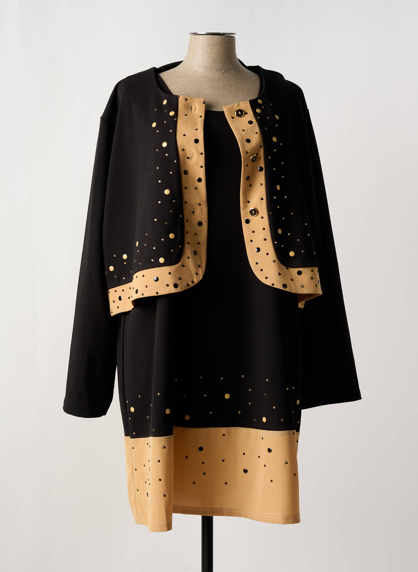 Profitez d’un ensemble robe signé LADY BELLE à prix mini pour sublimer votre garde-robe sans vous ruiner. Ce modèle élégant combine une robe noire rehaussée de larges bandes camel ornées de motifs dorés, associée à une veste assortie pour une allure raffinée et moderne. Parfait pour celles qui cherchent une tenue chic et confortable à petit prix, cet ensemble est une réelle opportunité pour un look stylé en toute simplicité.
