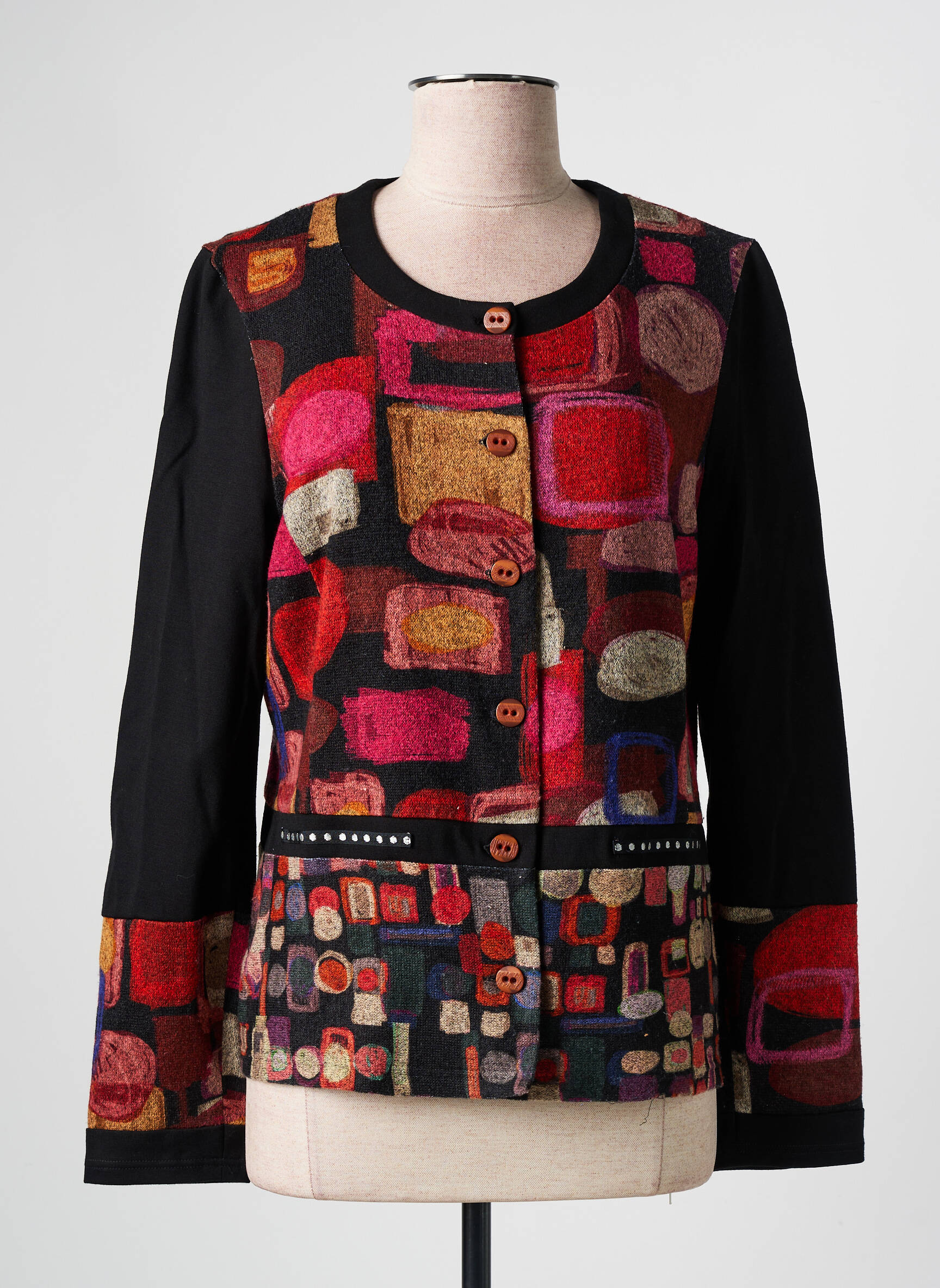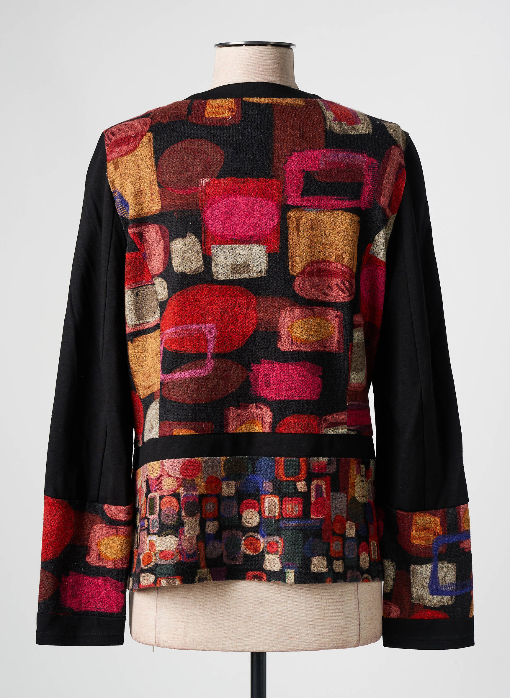 Craquez pour ce gilet manches longues GUY DUBOUIS pour femme qui allie originalité et petit prix, idéal pour apporter une touche artistique à votre garde-robe sans vous ruiner. Son design unique se distingue par un patchwork coloré de motifs géométriques aux tons chauds, en contraste avec des manches unies sombres, et sa coupe droite sublimera toutes vos tenues, du jean décontracté à la jupe élégante. C’est l’occasion parfaite de vous offrir une pièce de créateur à prix déstocké et de vous démarquer avec style sans faire exploser votre budget.