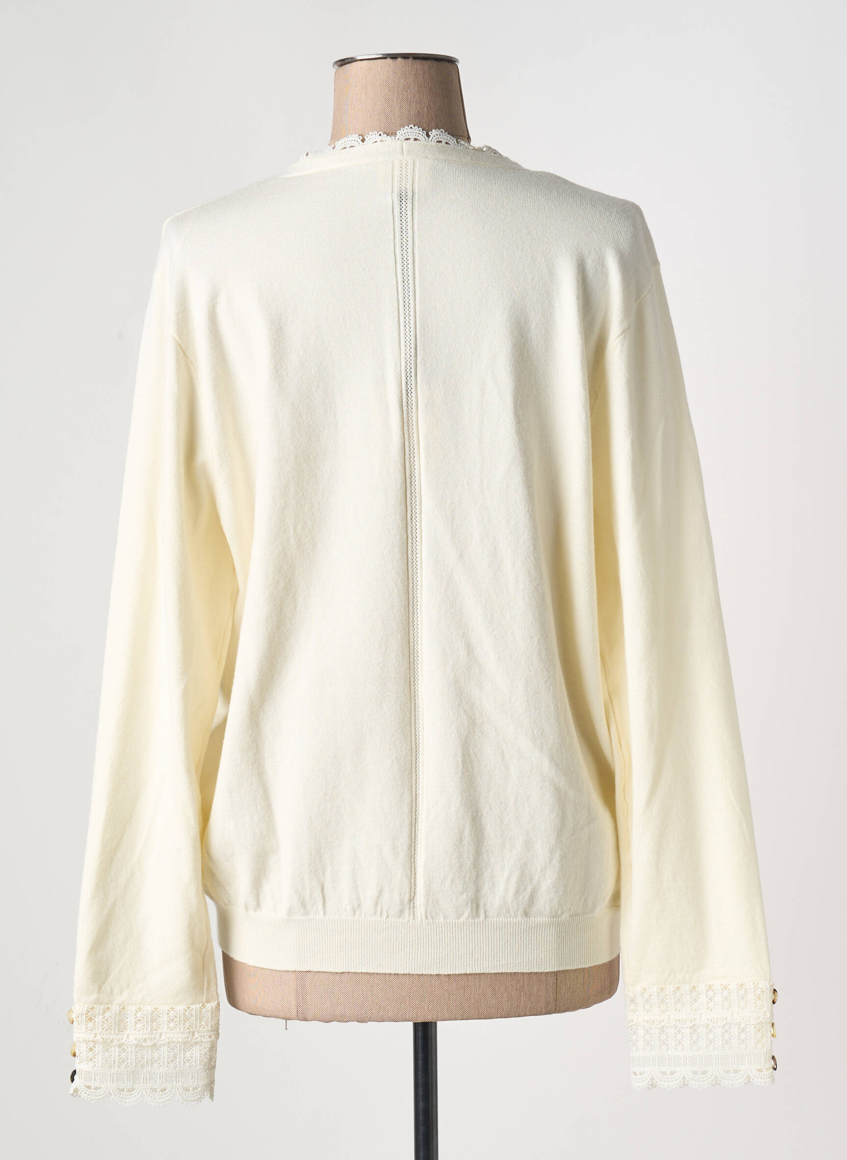 Profitez d'une offre irrésistible avec ce gilet manches longues signé JULIE GUERLANDE, un choix parfait pour ajouter une touche de féminité à petit prix à votre dressing. Ce modèle délicat séduit par sa couleur écrue élégante et sa finition raffinée, mise en valeur par un joli galon festonné au col V et tout le long de la patte de boutonnage, ainsi que sur les poignets, agrémentés de petits boutons brillants, pour une allure chic et soignée sans vous ruiner.