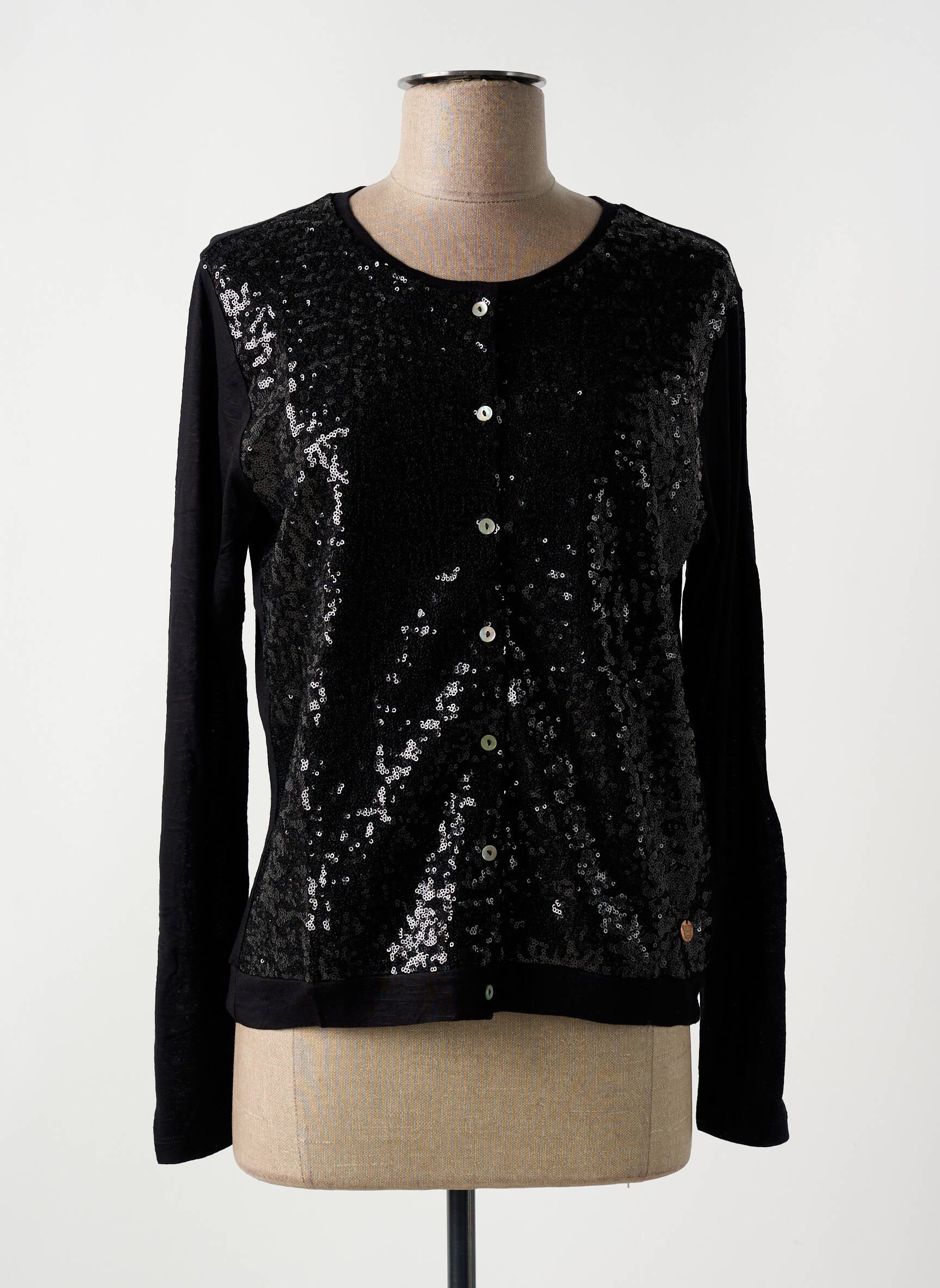 Craquez pour ce gilet à manches longues de la marque LE BOUDOIR D'EDOUARD, une pièce ultra tendance pour sublimer vos tenues sans vous ruiner. Son allure élégante se démarque grâce à son devant entièrement orné de sequins noirs qui capte la lumière et offre un effet scintillant irrésistible, tandis que le tissu uni des manches et du dos assure un confort optimal au quotidien. Les jolis boutons apportent la touche finale à ce modèle à la fois chic et facile à porter, c’est clairement l’occasion parfaite de se faire plaisir à petit prix avec style.