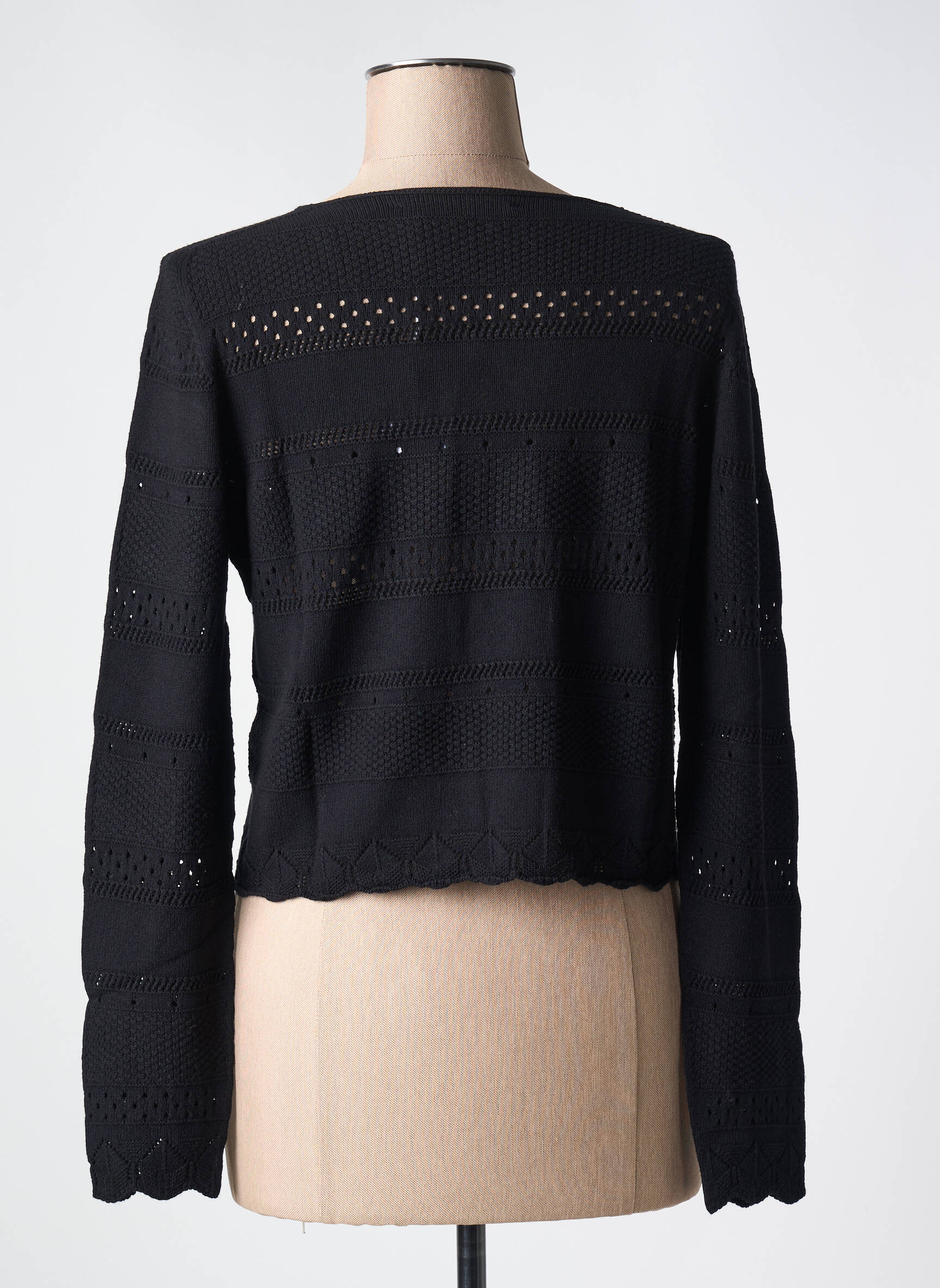Profitez d’un véritable bon plan avec ce gilet manches longues de la marque LE BOUDOIR D'EDOUARD, idéal pour compléter votre garde-robe sans vous ruiner. Ce modèle noir séduit par sa maille ajourée délicatement travaillée et sa coupe courte qui offre une touche d’élégance moderne à toutes vos tenues. Son unique bouton au col apporte une note raffinée et souligne son style sophistiqué, parfait pour rehausser vos looks du quotidien à petit prix.