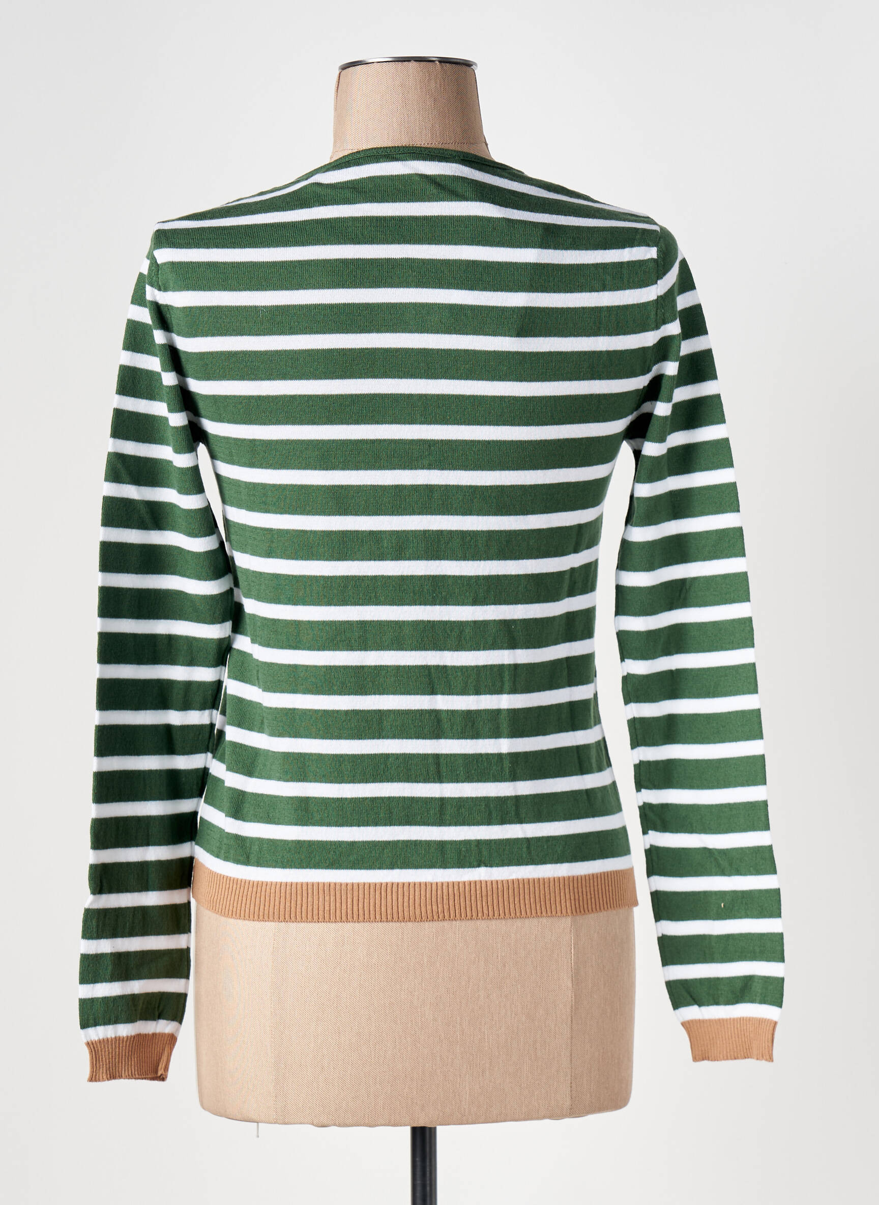 Craquez pour ce gilet manches longues LE BOUDOIR D'EDOUARD, un vrai bon plan pour donner du style à votre garde-robe sans vous ruiner. Avec ses rayures vertes et blanches et ses finitions contrastantes camel au col et à la base, il apporte une touche moderne et décontractée à vos tenues, parfait pour un look tendance à petit prix.