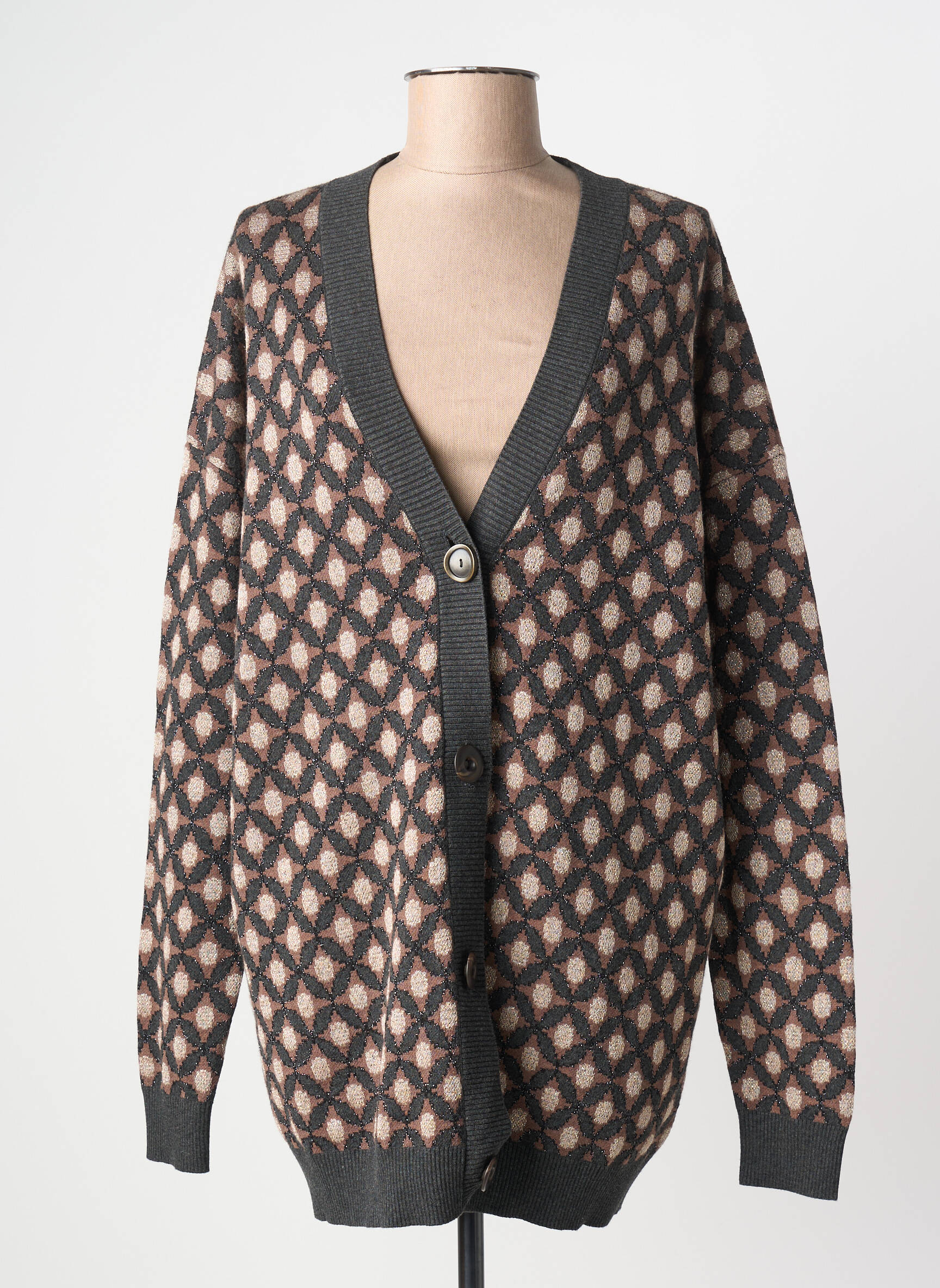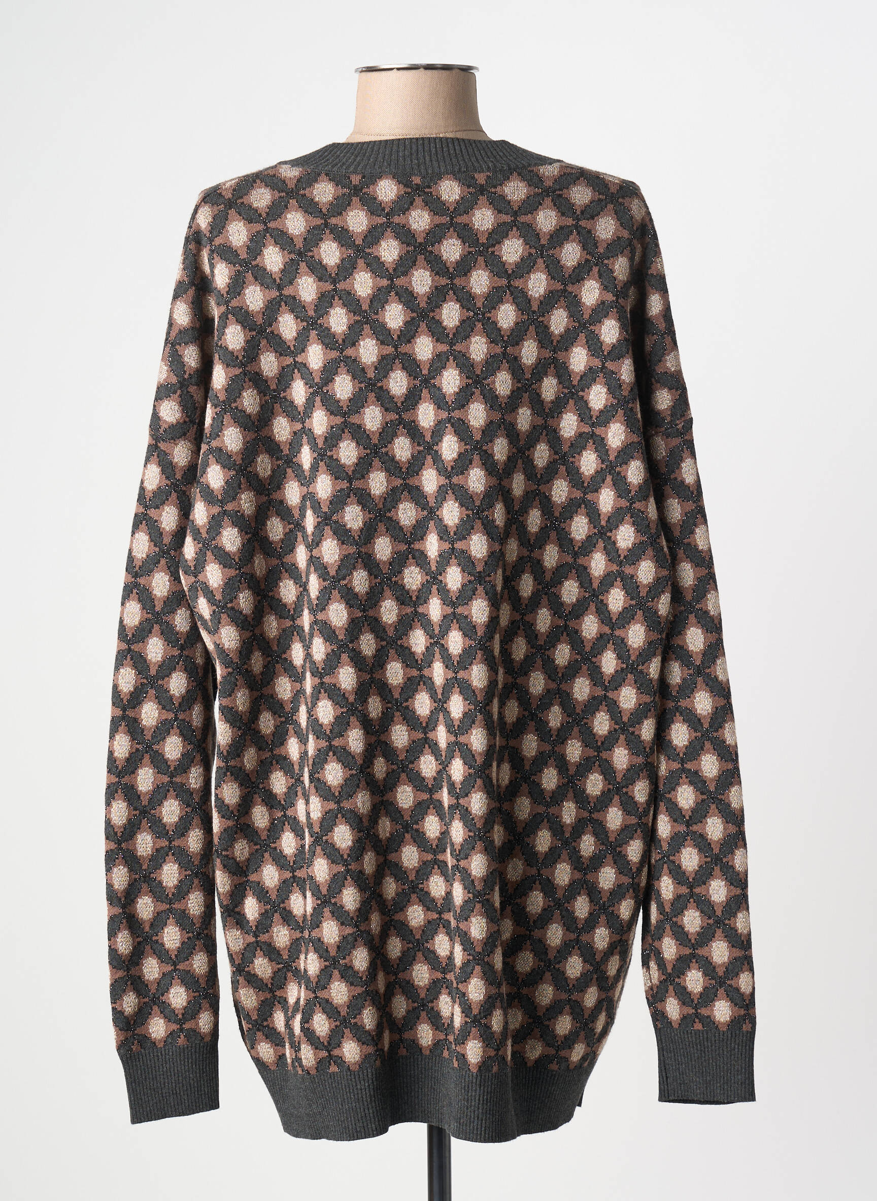 Profitez d'une véritable affaire avec ce gilet manches longues pour femme signé MALIPARMI, idéal pour celles qui cherchent à se faire plaisir sans se ruiner. Son motif graphique tout en douceur apporte une touche rétro et élégante, tandis que sa coupe légèrement ample promet confort et facilité au quotidien. Les finitions contrastées sur le col en V, les poignets et le bas du gilet mettent en valeur un style raffiné, parfait pour compléter vos tenues de saison en toute simplicité. Un choix malin pour un dressing tendance à prix doux.