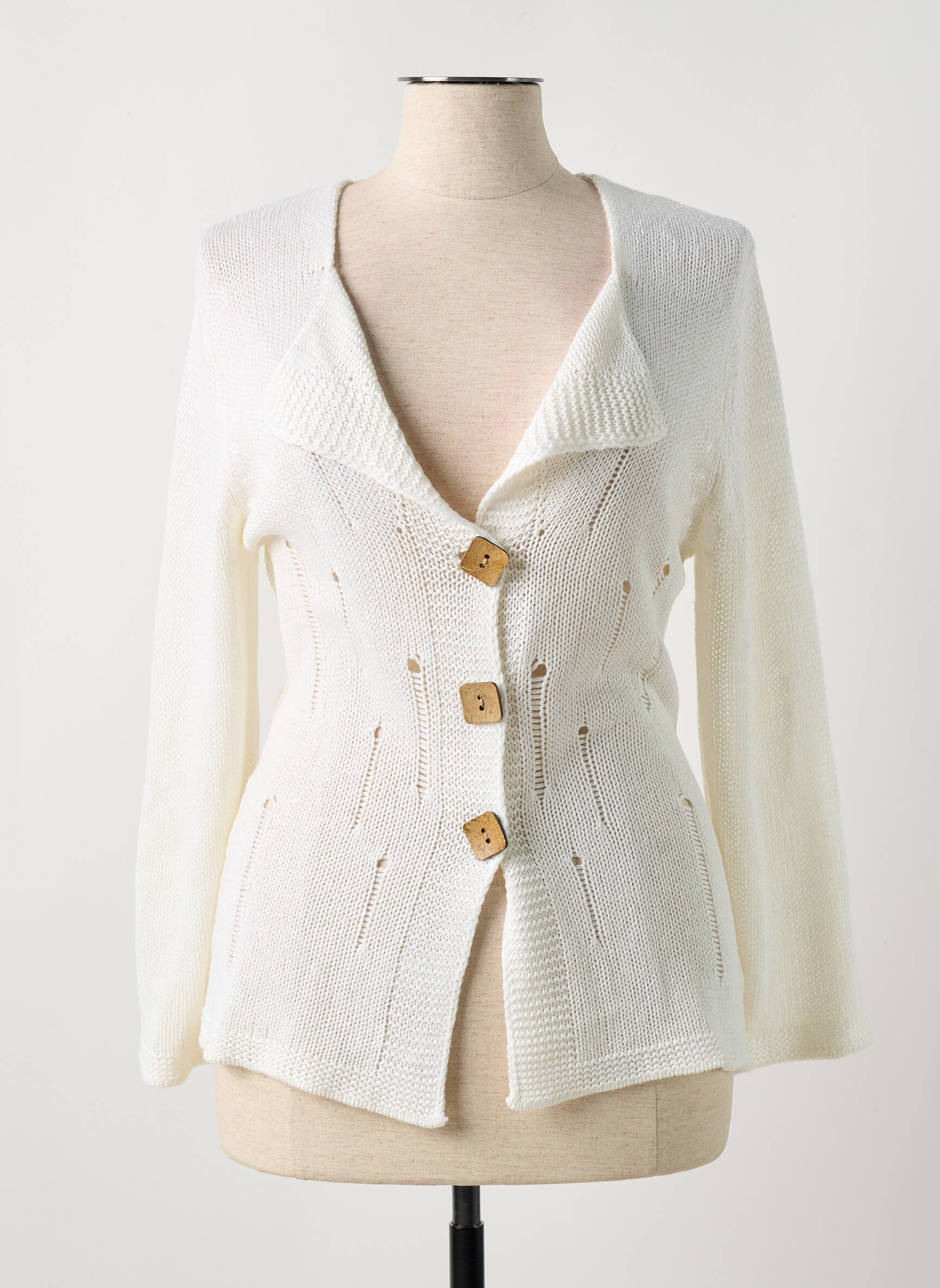 Profitez d'un vrai bon plan mode avec ce gilet manches longues de la marque MARBLE, une pièce élégante et féminine à petit prix qui fait rimer économie et style. Avec son col large et sa maille ajourée au motif discret, ce gilet blanc cassé rehaussé de trois boutons carrés façon bois apporte une touche chic et originale à toutes vos tenues, idéal pour renouveler votre garde-robe sans vous ruiner.