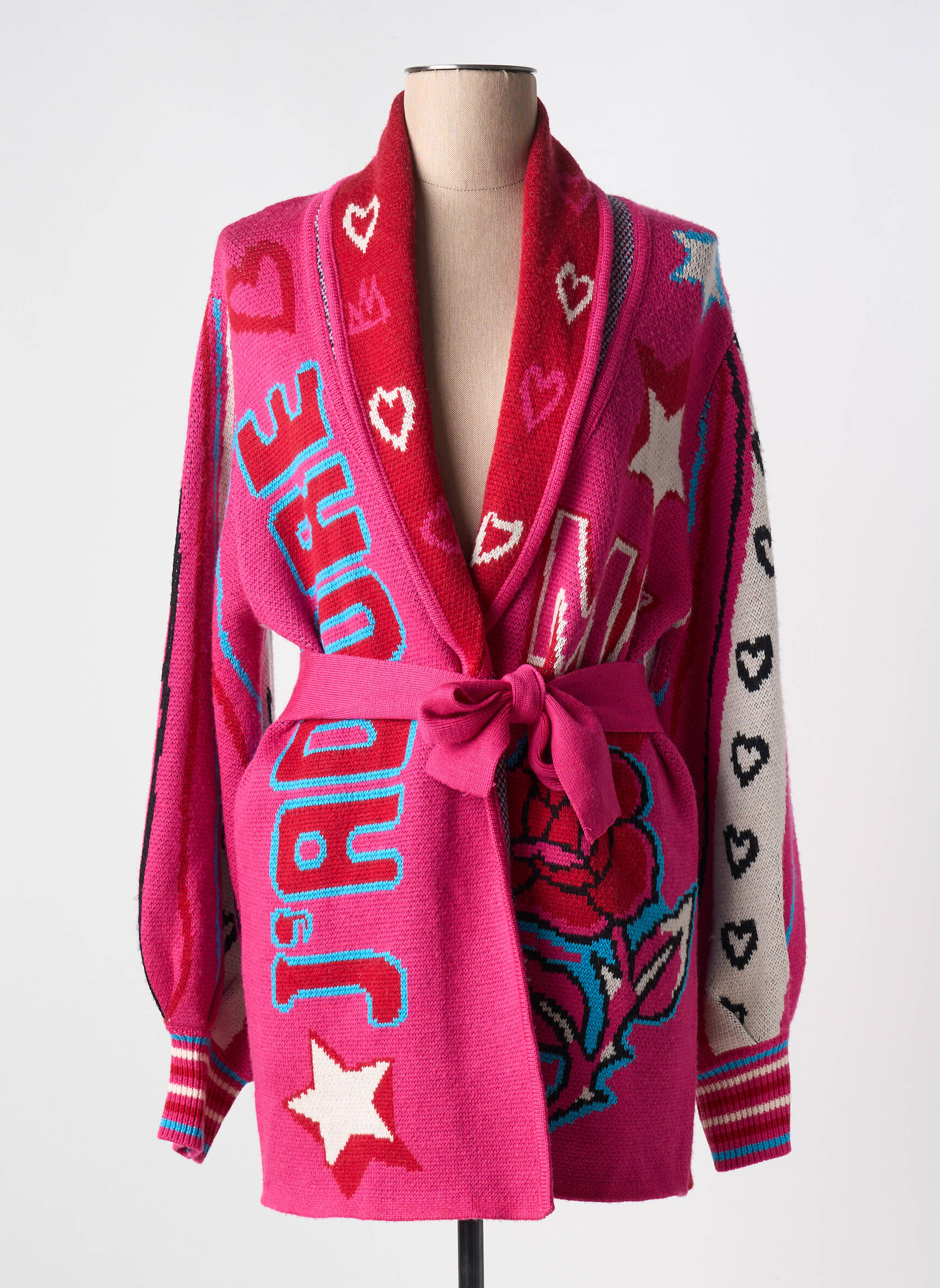 Offrez-vous ce superbe gilet manches longues ME369 à petit prix et affichez un style unique sans vous ruiner. Sa couleur rose vibrante rehaussée de motifs graphiques, de cœurs, d’étoiles et de l’inscription « J’ADORE » apporte une touche pop et optimiste à toutes vos tenues. Ce modèle à la coupe confortable se distingue par sa ceinture à nouer qui vient structurer la silhouette et met véritablement en valeur l’esprit créatif de la marque, une véritable affaire à ne pas manquer pour booster votre dressing avec originalité.