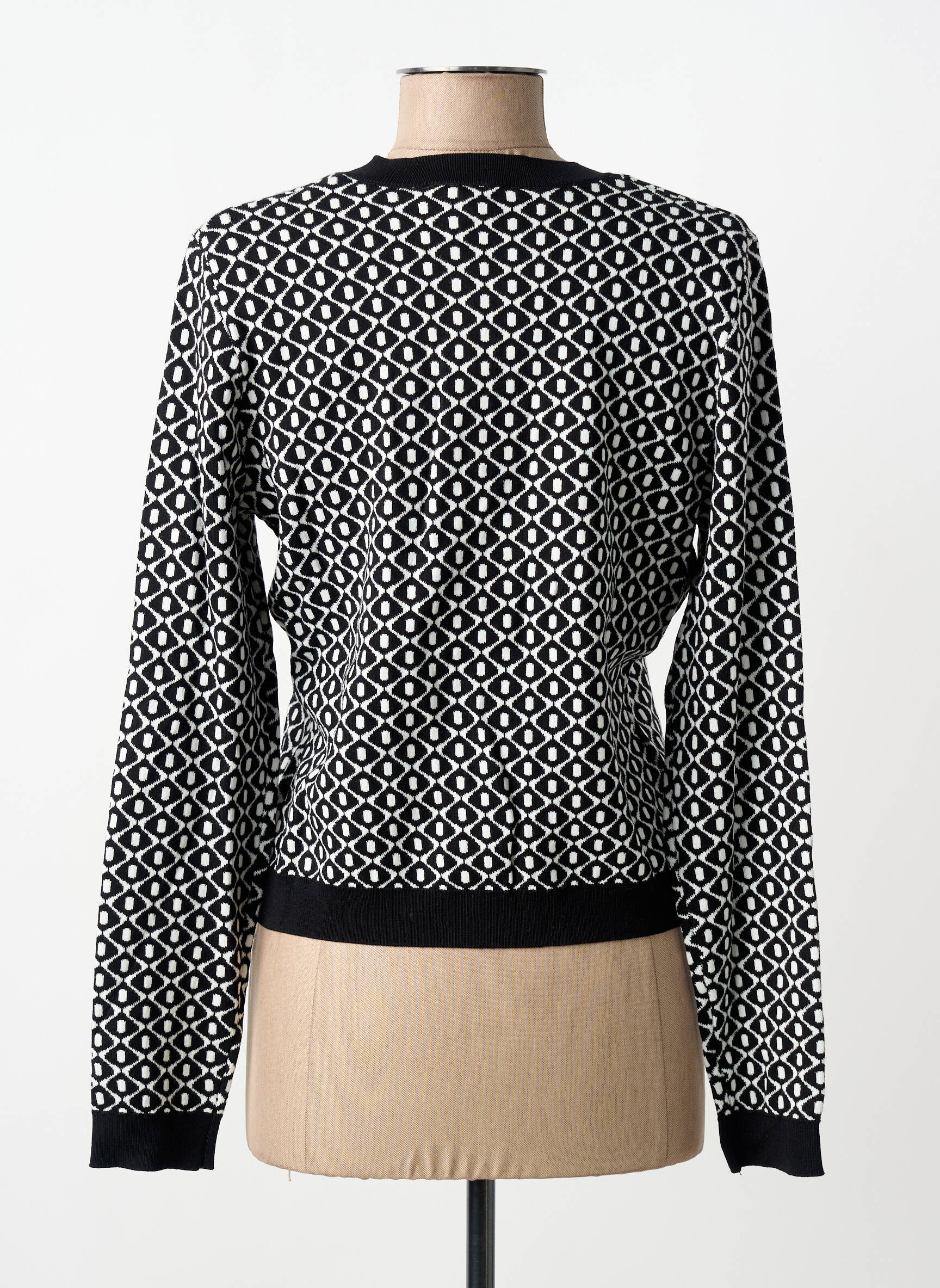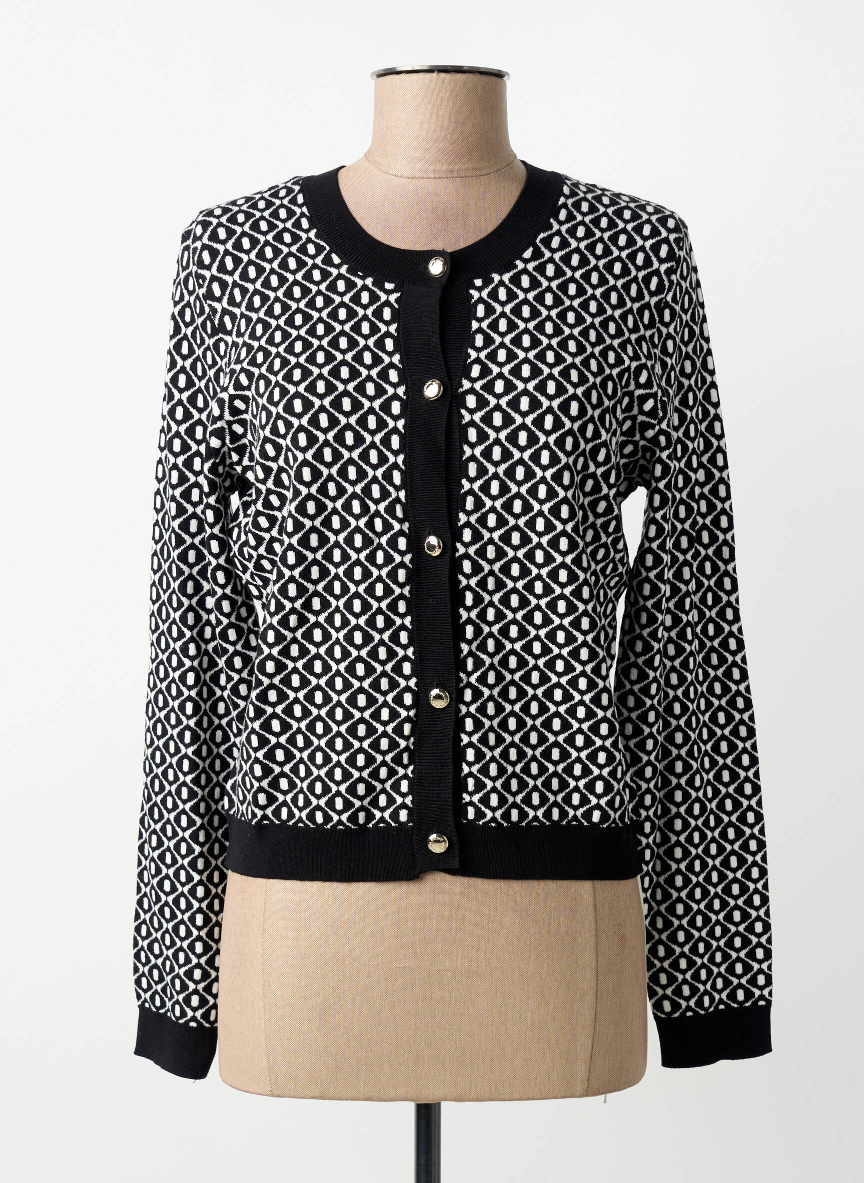 Profitez d’une belle opportunité pour enrichir votre garde-robe avec ce gilet manches longues signé Morgan, un indispensable à prix réduit qui combine élégance et confort. Son motif graphique noir et blanc apporte une touche sophistiquée à toutes vos tenues, tandis que ses finitions contrastantes et sa rangée de boutons dorés assurent un style moderne et raffiné, idéal pour un look chic sans vous ruiner.