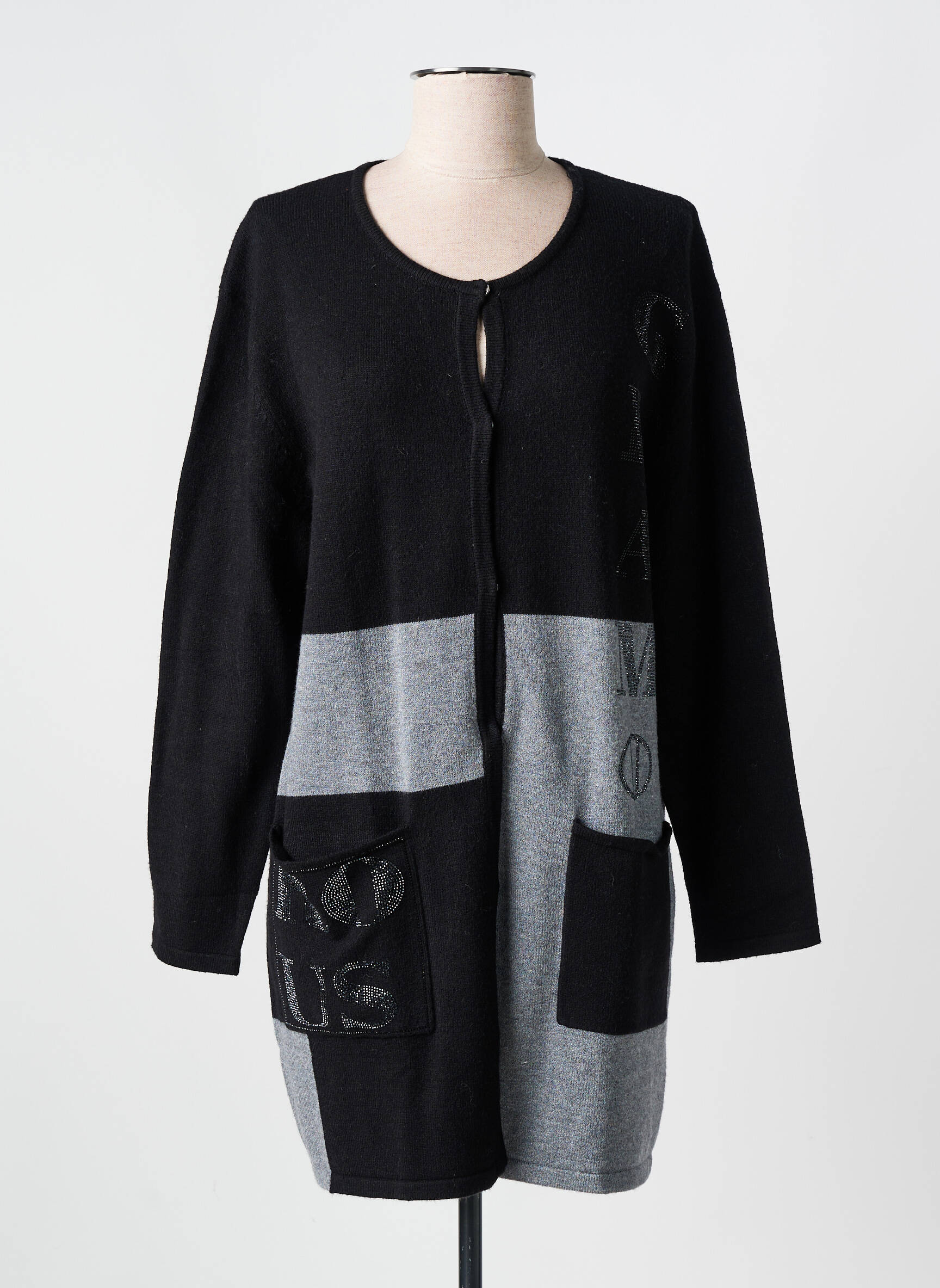 Imaginez un gilet qui réinvente la sobriété en un jeu subtil de contrastes : ce modèle PASSIONI pour femme allie une silhouette droite à manches longues à une association audacieuse de noir et de gris, ponctuée de lettres graphiques en ton sur ton qui apportent une touche d’originalité discrète. Son encolure arrondie et son ouverture par boutons cachés soulignent une élégance minimaliste, tandis que ses deux poches à l’avant ajoutent une note pratique et contemporaine à cet incontournable du dressing féminin.