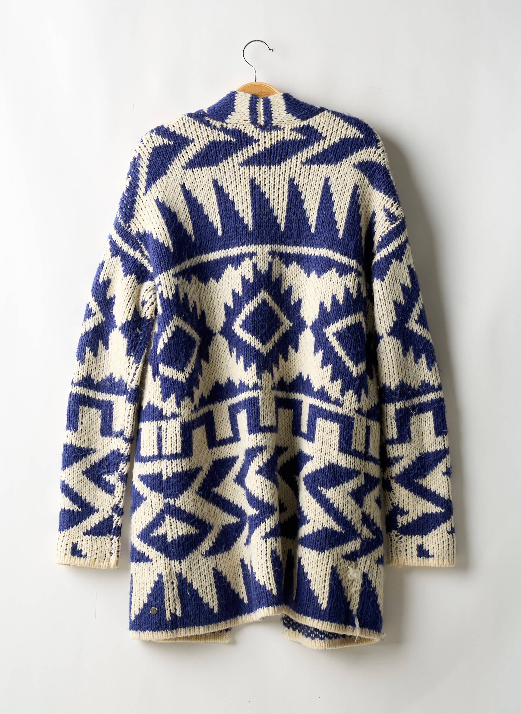 Pour un look décontracté mais travaillé, enfile ce gilet par-dessus un t-shirt uni ou une chemise en jean et complète avec un jean slim ou un pantalon taille haute. Tu peux aussi l’associer à un short en denim et des bottines pour une allure bohème, ou l'accessoiriser avec un bonnet et un grand sac cabas pour une touche cosy en ville. Les couleurs neutres ou les tons bleus délavés s’harmonisent parfaitement avec les motifs de ce gilet pour un ensemble harmonieux et tendance.