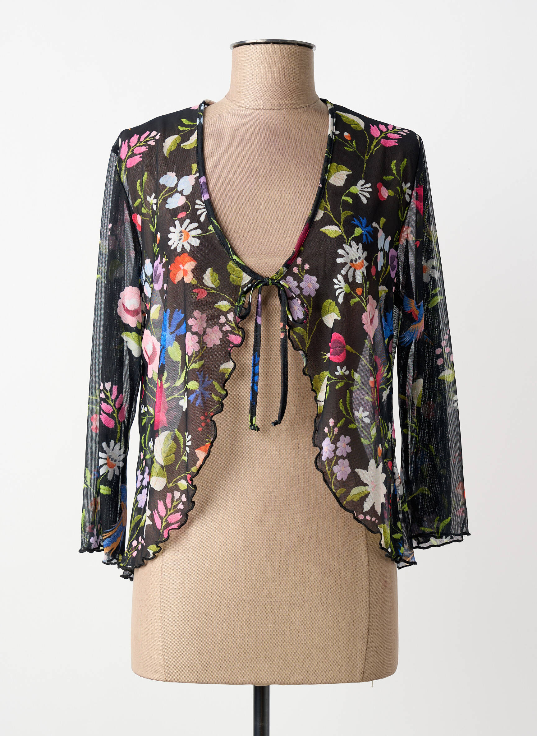 Profitez d'une véritable affaire avec ce gilet manches longues SAINT CHARLES pour femme, parfait pour ajouter une touche de féminité et d’originalité à votre garde-robe à petit prix. Ce modèle séduit par sa transparence légère ornée d’un somptueux motif fleuri multicolore, offrant un jeu de superpositions élégant et raffiné. Sa coupe ouverte à nouer délicatement sur le devant souligne la silhouette tout en apportant une note romantique à toutes vos tenues, idéal pour sublimer un look de journée ou de soirée sans se ruiner.