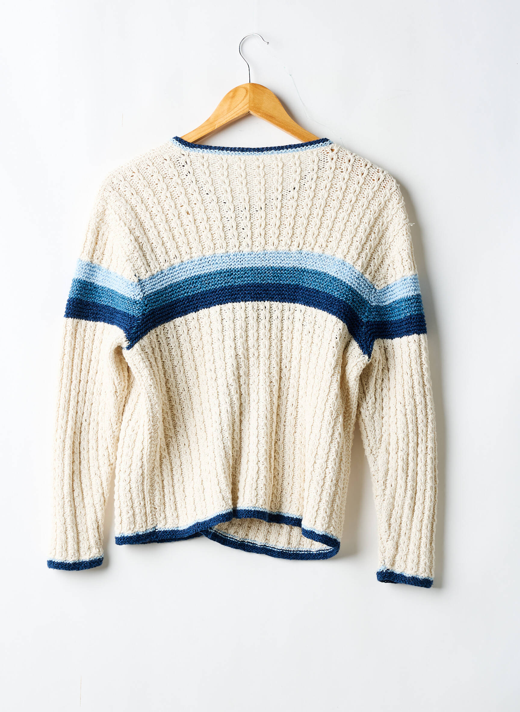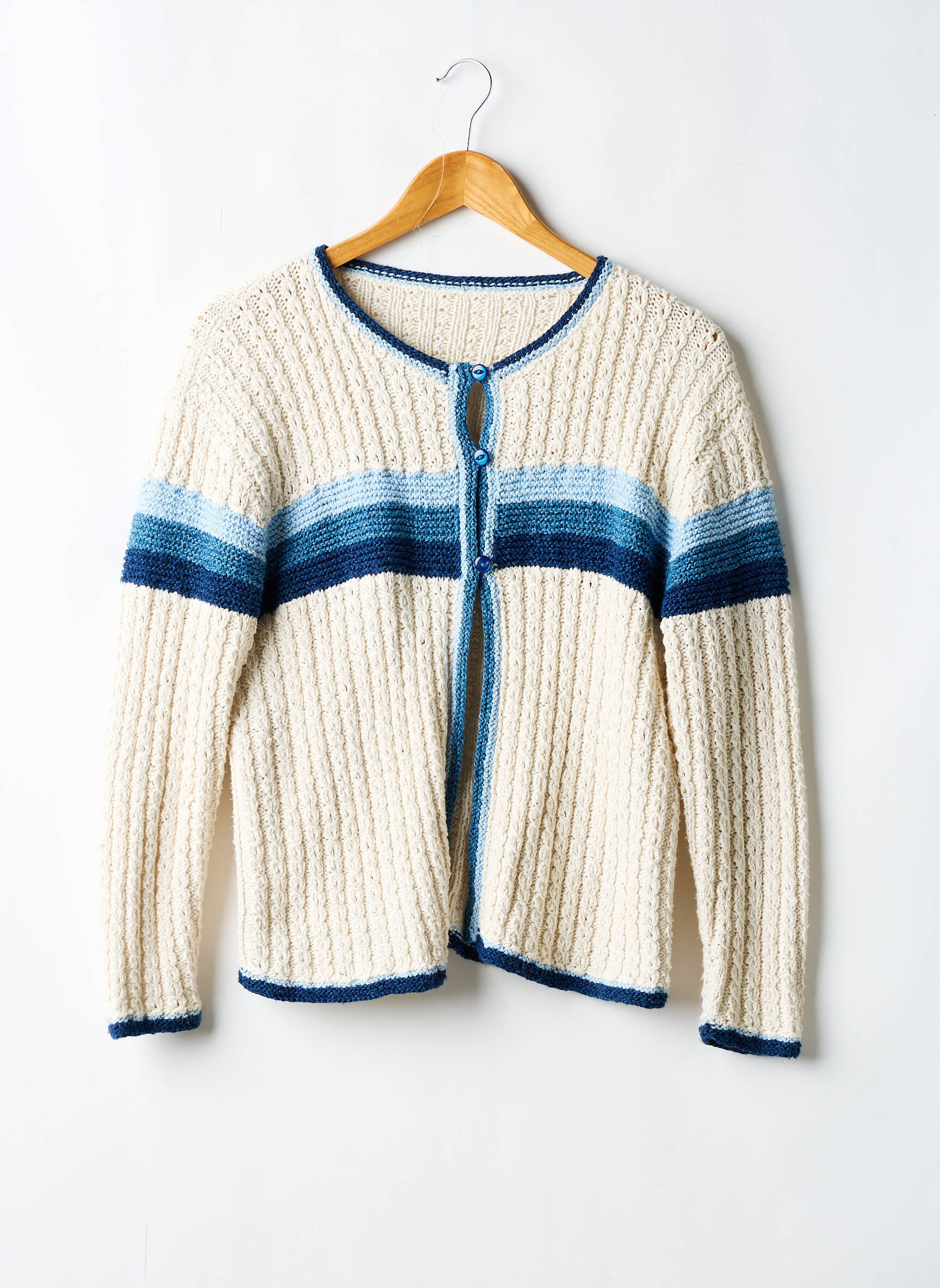 Offrez-vous ce gilet manches longues pour femme à prix tout doux, parfait pour allier confort et style sans se ruiner. Son tricot à relief en maille écrue est mis en valeur par une large bande bleue contrastante au niveau du buste et des bras, tandis que les finitions bleu marine au col, à la fermeture et aux poignets apportent une touche moderne et graphique. Avec sa coupe droite et son ouverture pratique, il accompagne toutes vos tenues du quotidien pour une allure décontractée et tendance à petit prix.