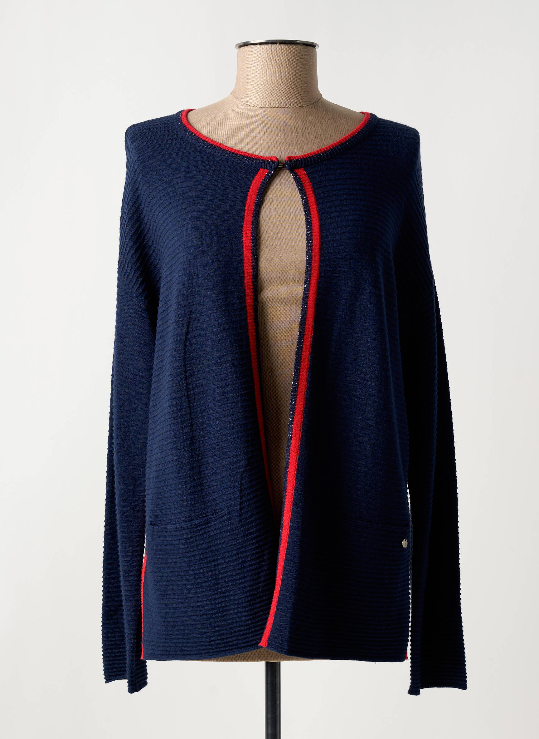Profitez d’un bon plan mode avec ce gilet manches longues pour femme de la marque Thomas Rabe, parfait pour sublimer votre look à petit prix. Sa maille bleu marine, relevée d’un liseré rouge contrastant le long de l’encolure et de l’ouverture, lui confère une touche chic et moderne tout en simplicité, tandis que sa coupe confortable et élégante permet de l’associer facilement à toutes vos tenues du quotidien. C’est le choix idéal pour rester tendance tout en faisant des économies sans compromis sur la qualité.