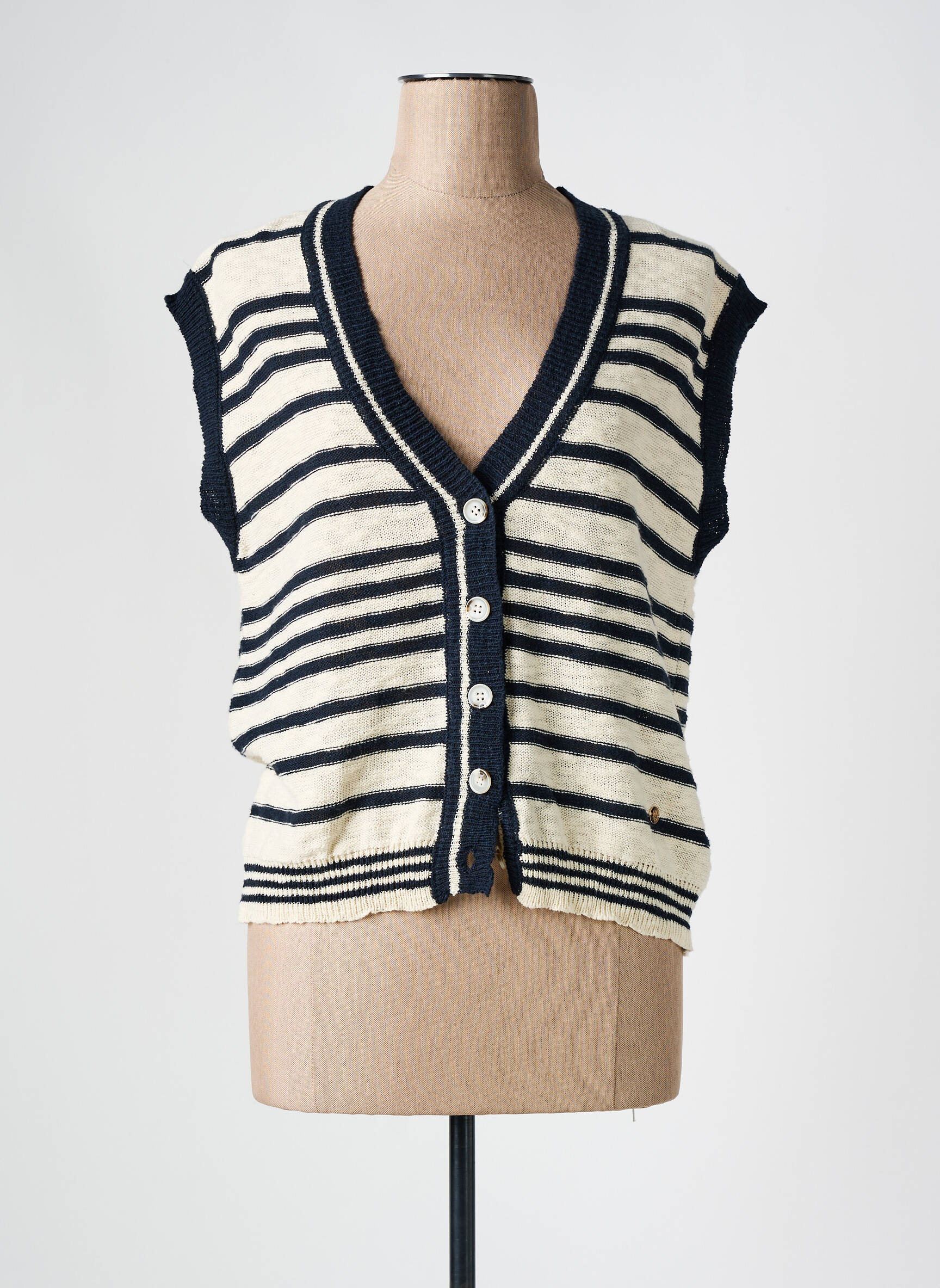 Craquez pour ce gilet manches courtes LA PETITE ETOILE, un essentiel chic et tendance à prix tout doux qui sublime votre dressing sans faire exploser votre budget. Sa coupe légèrement ample et son motif rayé bleu marine sur fond écru apportent une touche moderne et élégante, tandis que le col en V et les finitions contrastées accentuent son style raffiné. Boutonné sur le devant, il se porte facilement sur un t-shirt, une blouse ou même à même la peau pour un look décontracté. Profitez de ce bon plan pour ajouter une pièce mode à petit prix à votre collection !