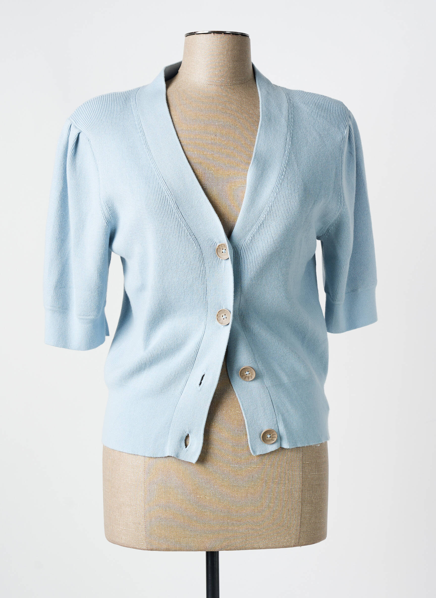 Plongez dans un océan de douceur avec ce gilet à manches courtes de la marque RODIER, qui se distingue par sa teinte bleu pâle délicate et apaisante. Ce vêtement chic et féminin présente un décolleté en V qui met en valeur la silhouette, tandis que ses boutons élégants ajoutent une touche de sophistication. Les manches légèrement bouffantes offrent une silhouette contemporaine, parfaite pour les journées printanières ou estivales. Ce gilet est idéal pour superposer avec élégance une blouse ou une robe, apportant une note de fraîcheur et de modernité à votre garde-robe.