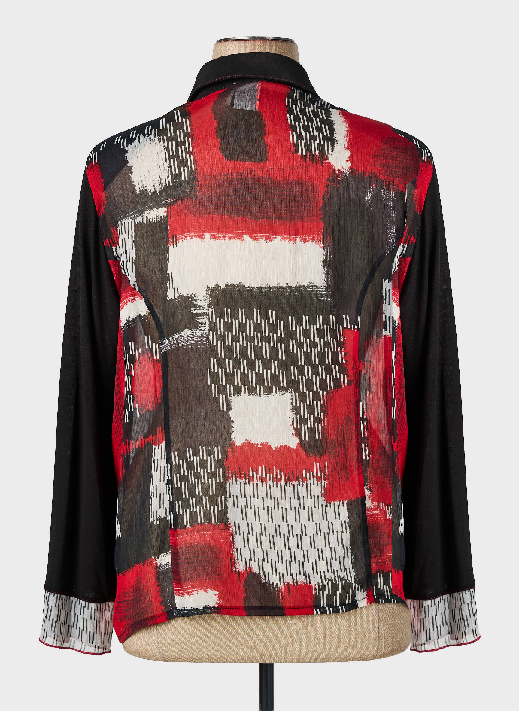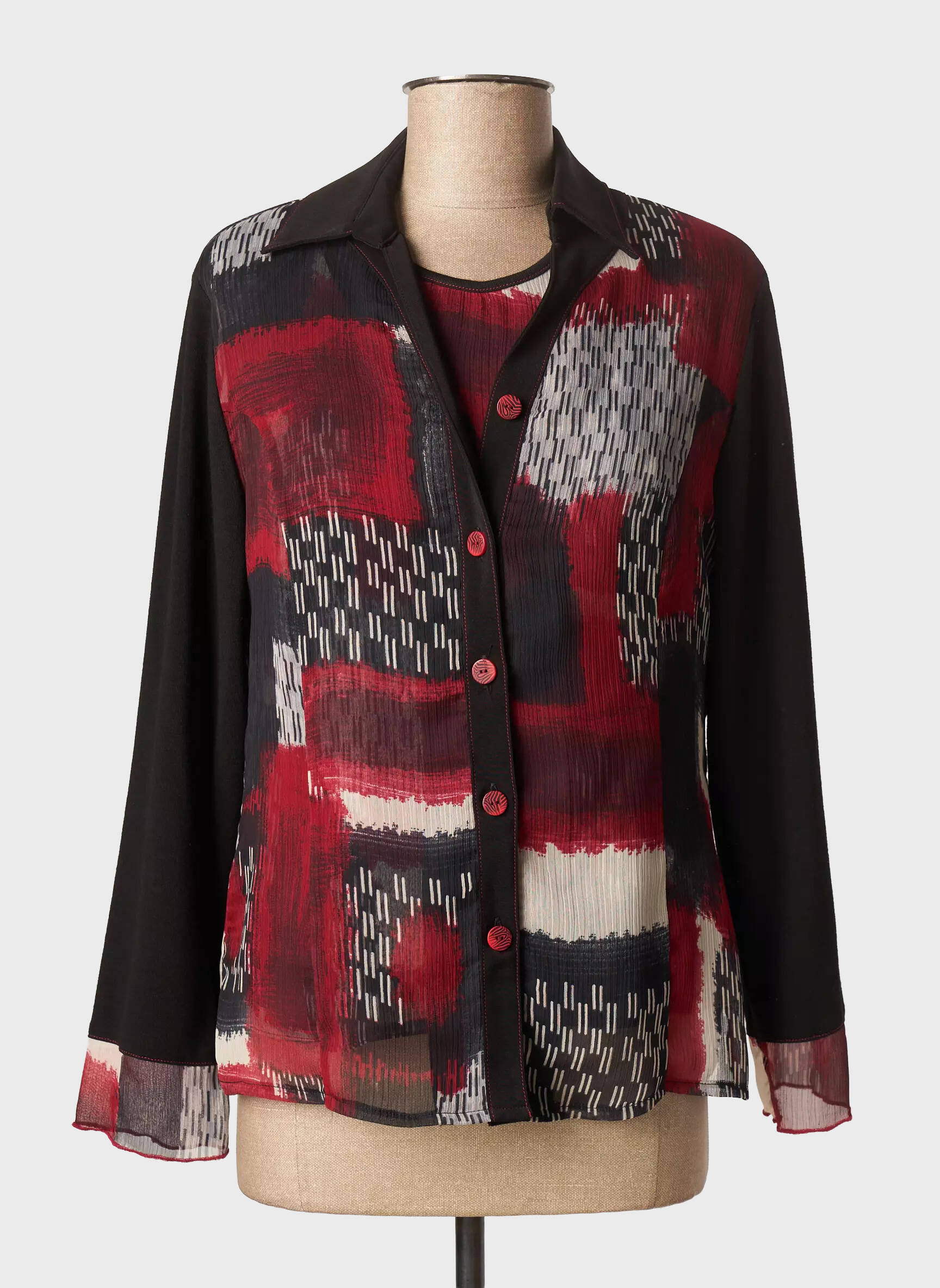 Veste manches longues : Col chermisier. Crêpe. Imprimé. Boutons sur le devant. Cintrée. Top sans manches : Col rond. Crêpe. Imprimé. Bouton au dos.