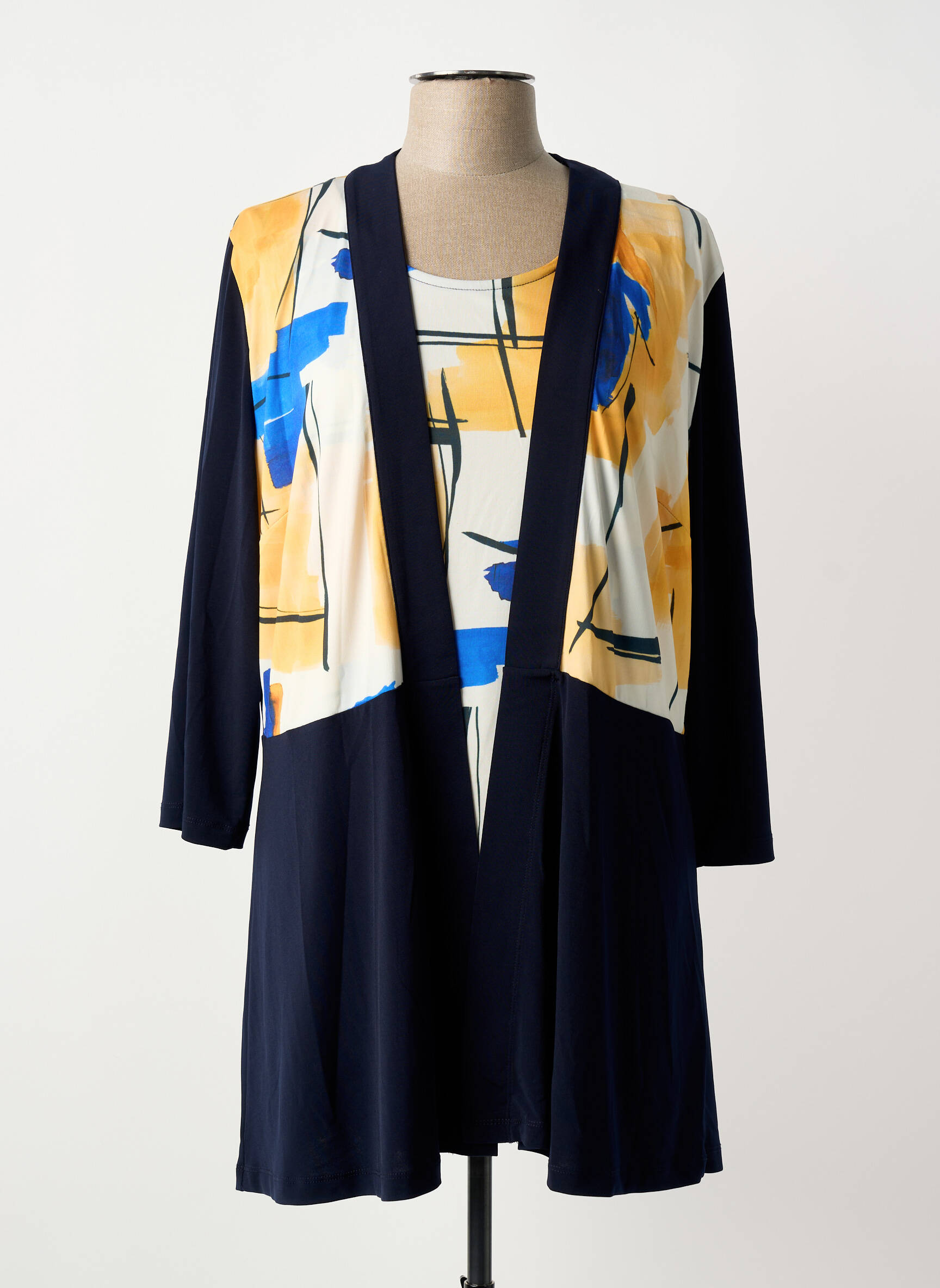 Craquez pour ce twin-set de la marque GUY DUBOUIS, une pièce incontournable pour renouveler votre garde-robe à prix tout doux. Avec son camaïeu de bleu marine et ses touches colorées dans des tons jaunes et bleus, il illumine instantanément votre tenue, tout en offrant une allure élégante et moderne grâce à son imprimé graphique raffiné. Pratique et polyvalent, ce modèle permet de multiplier les looks sans se ruiner, idéal pour rester chic tous les jours sans compromis sur votre budget.