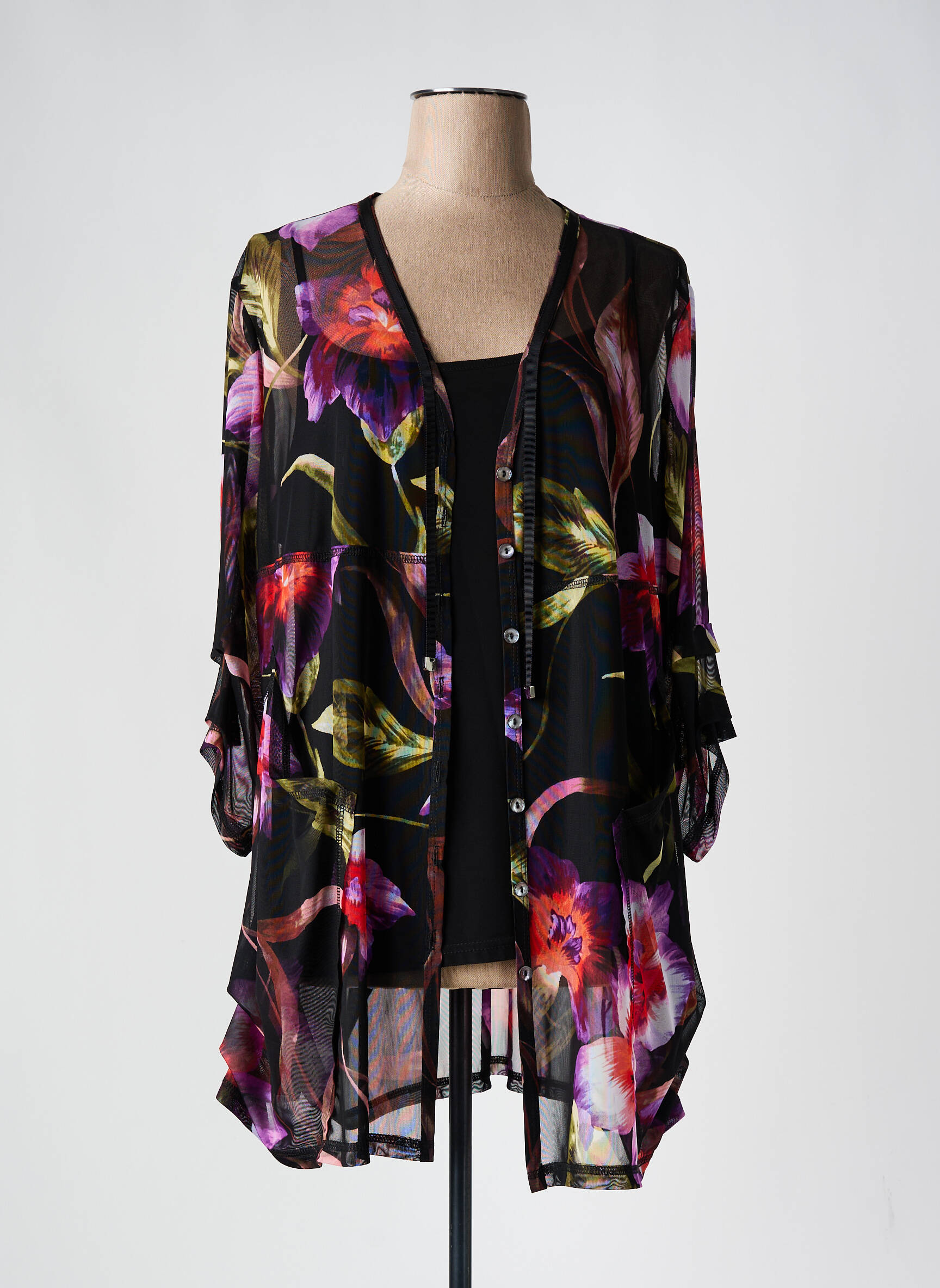Craquez pour ce twin-set JOSEPH RIBKOFF pour femme, une véritable affaire à ne pas manquer pour ajouter une touche d’élégance à petit prix à votre garde-robe. Composé d’une veste fluide et transparente ornée de motifs floraux éclatants sur fond noir, ce modèle se démarque par son allure légère et sophistiquée, tandis que son top uni assorti assure un effet chic et facile à associer. Profitez de ce bon plan pour sublimer vos looks sans vous ruiner avec une pièce exclusive et raffinée à prix déstockage.