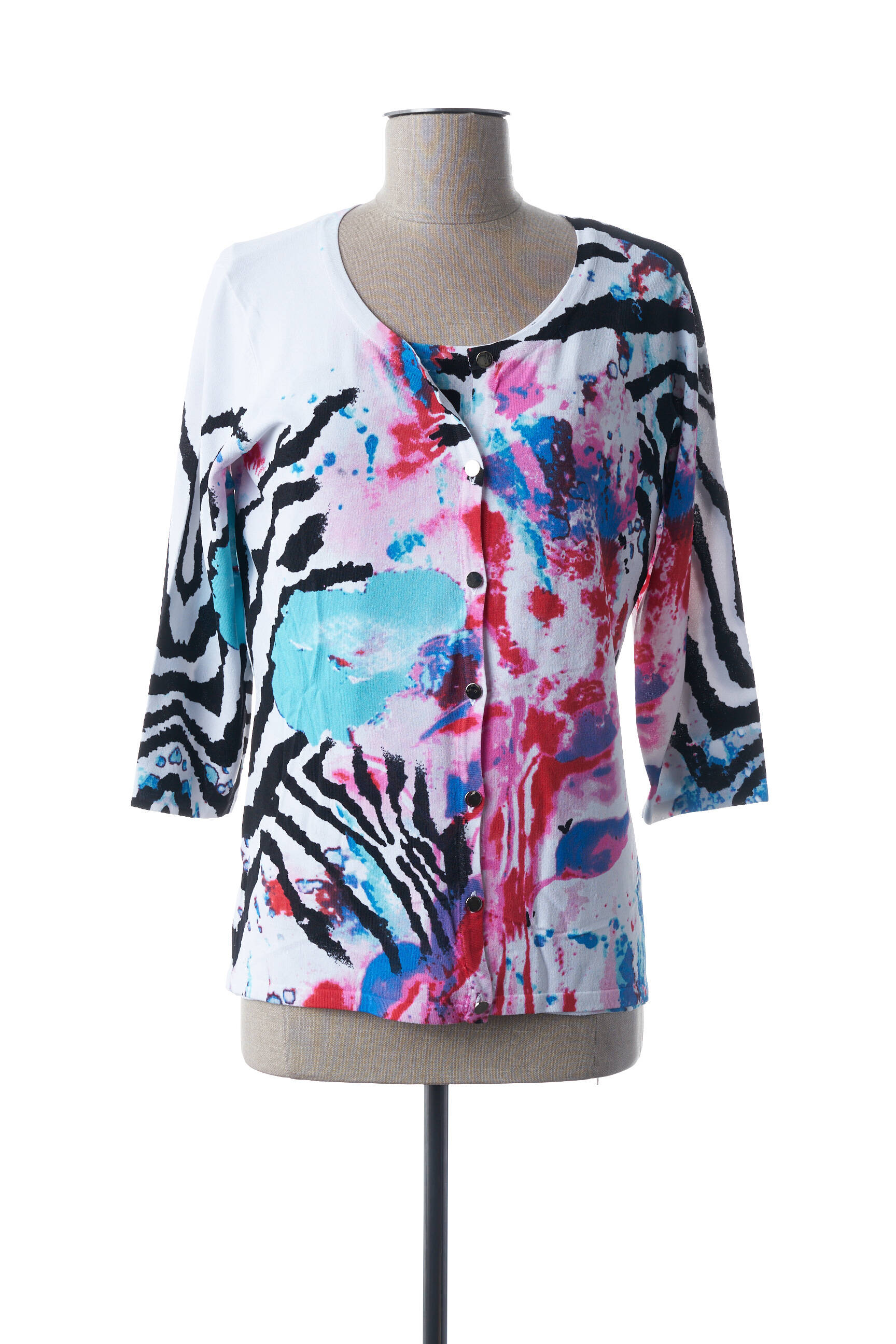 Twin set : Matière : Maille fine. Imprimé fantaisie. Pull : Col rond. Manches courtes. Coupe cintrée. Gilet : Col rond. Manches 3/4. Coupe cintrée. Fermeture boutonnée.