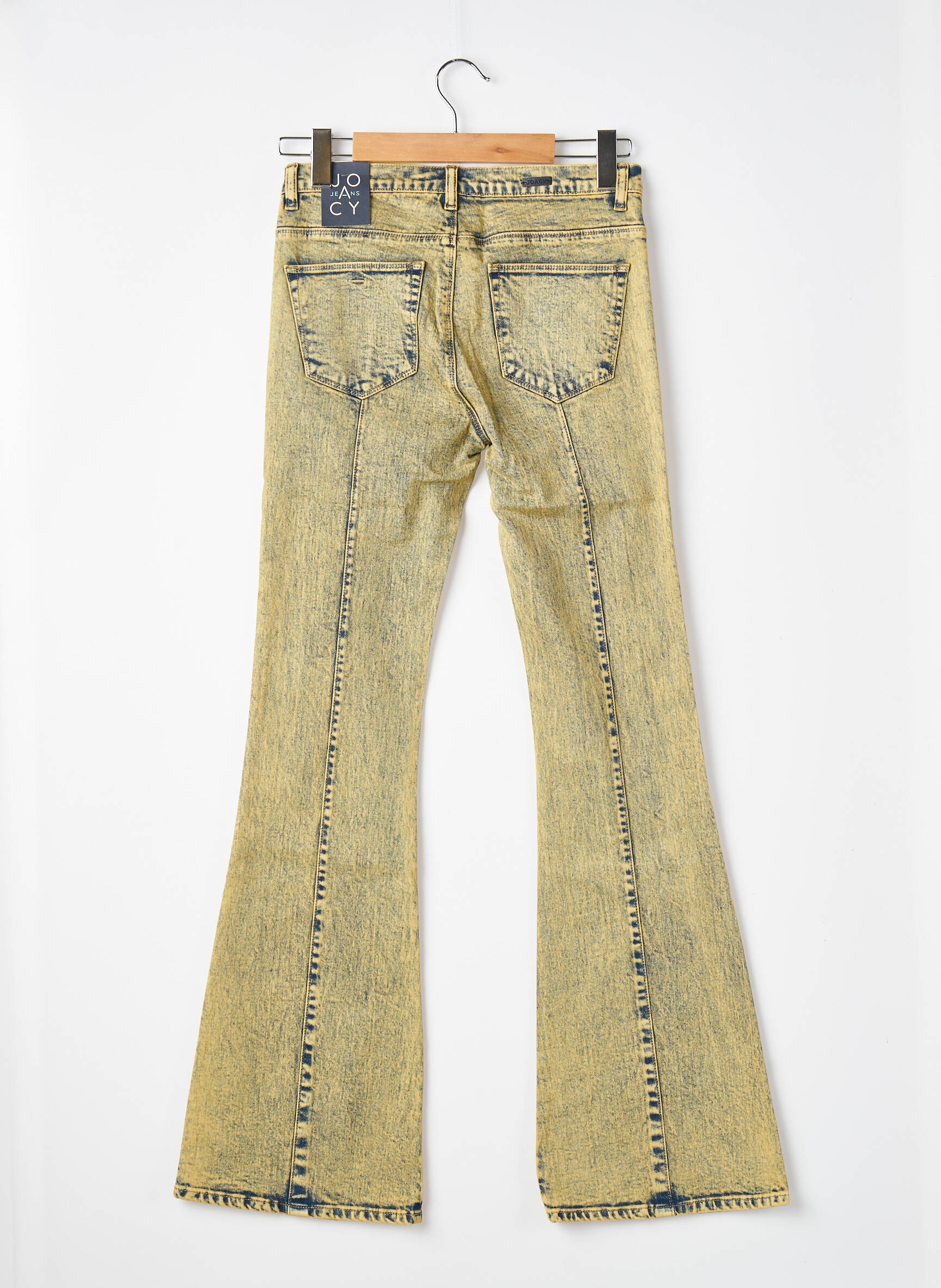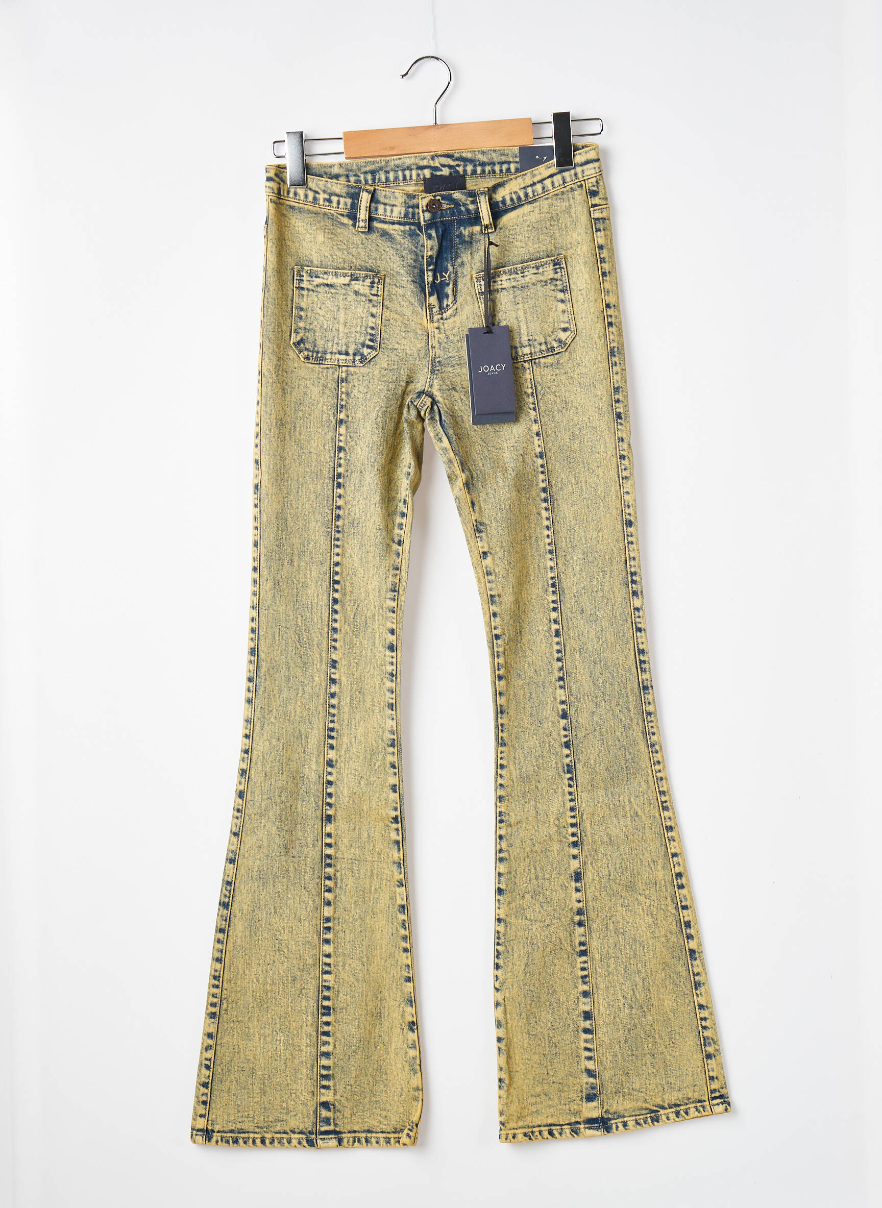 Imaginez un jean qui capte à la fois l’esprit vintage et une touche d’audace moderne : ce modèle flare signé JOACY révèle une teinte jaune délavée subtilement marbrée, sublimée par des coutures apparentes bleu foncé qui dessinent un contraste saisissant. Les poches avant carrées, brodées d’un tracé irrégulier, ajoutent un détail original, tandis que la coupe évasée met en valeur la silhouette avec une allure rétro-chic irrésistible. Parfait pour celles qui veulent allier confort et caractère dans un style unique.