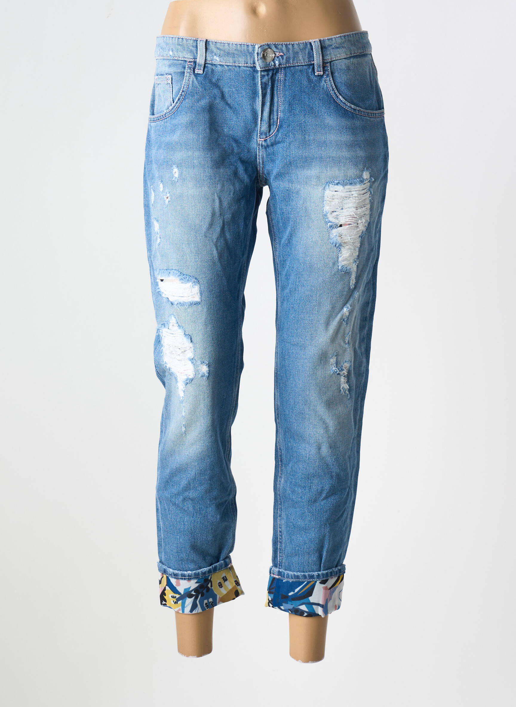 Saisissez l'opportunité de vous offrir un jeans boyfriend signé TRUSSARDI JEANS à prix mini, un vrai bon plan pour renouveler votre garde-robe avec style sans vous ruiner. Ce jean au look décontracté présente un effet usé tendance et des revers aux chevilles doublés d’un tissu imprimé qui apportent une touche originale et féminine à la silhouette. Sa coupe ample et confortable s’associe aussi bien à des baskets qu’à des talons pour un look urbain chic ultra moderne, à saisir vite pour faire de vraies économies sur une grande marque.