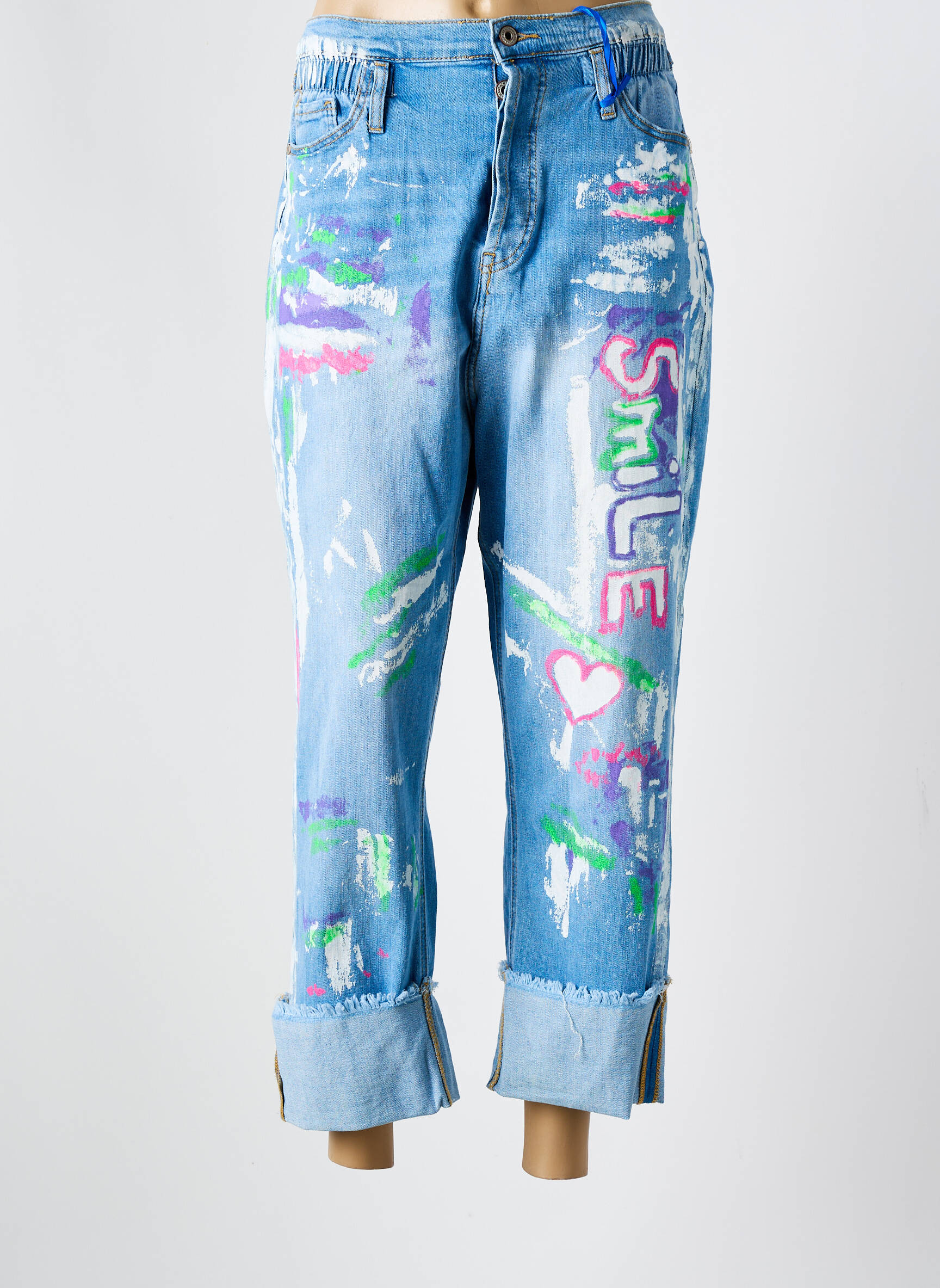 Profitez d’une occasion à prix mini avec ce jeans coupe droite de la marque S.WOMAN, qui affiche un design original grâce à ses motifs colorés façon peinture et son inscription « SMILE » pleine de bonne humeur. Ce modèle se distingue par ses larges revers en bas de jambe et ses détails usés, apportant une touche artistique et urbaine à votre look tout en vous permettant de réaliser une belle économie sur une pièce tendance et affirmée.