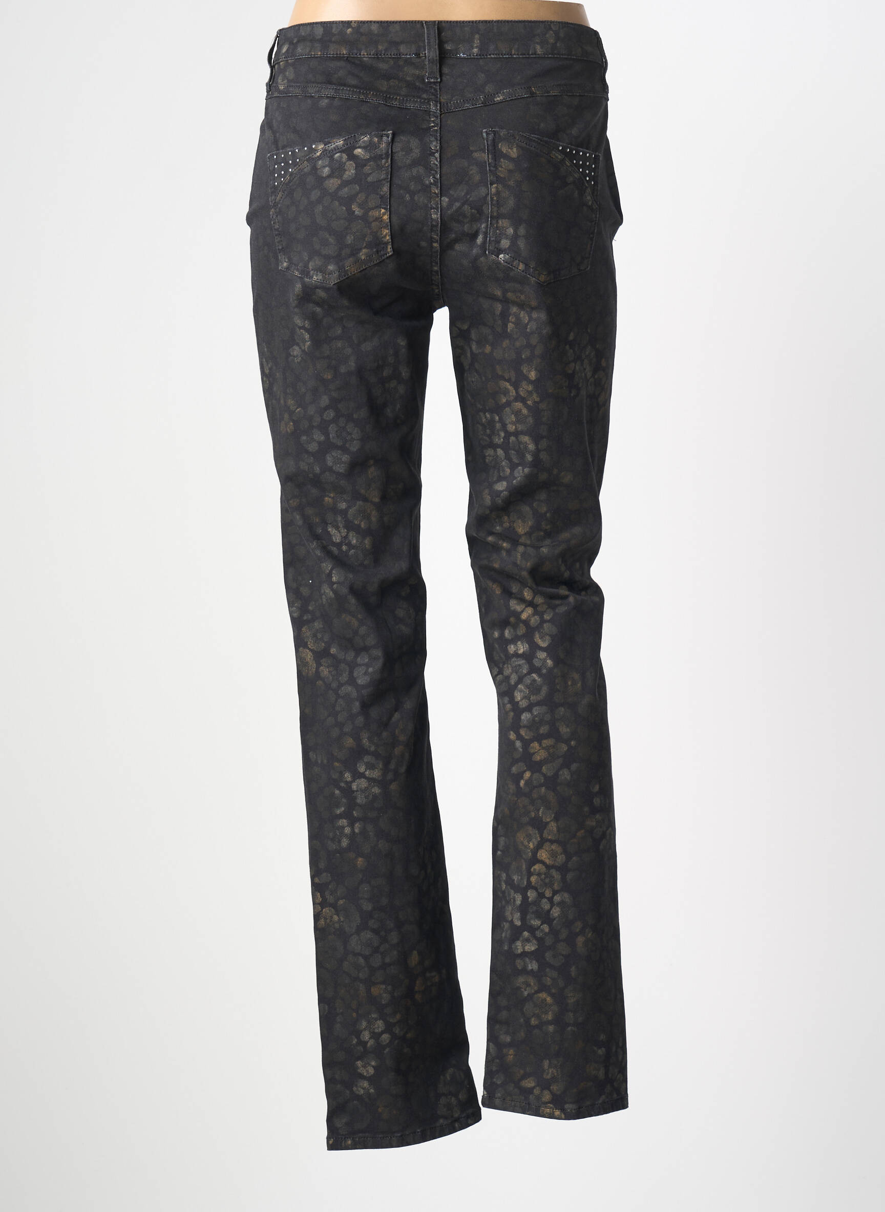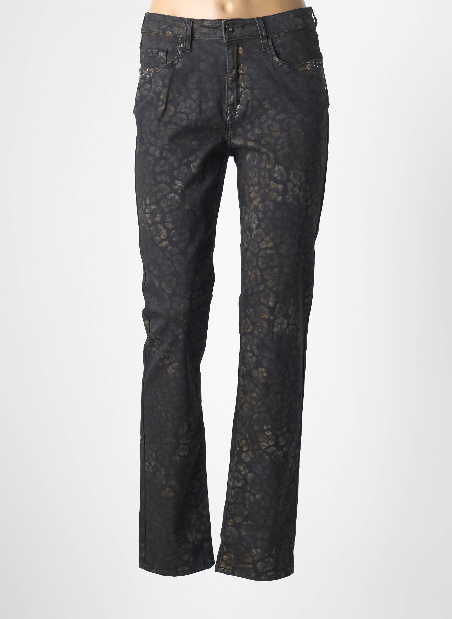 Ce jean devient vite une pièce maîtresse pour composer une tenue moderne et pleine de caractère. Il s’accorde parfaitement avec un top uni ou un chemisier fluide pour mettre en valeur son imprimé original. Pour un style plus affirmé, vous pouvez ajouter une veste courte, et côté chaussures, des bottines ou des baskets blanches sont idéales. Quelques accessoires dorés ou sobres viendront compléter l’ensemble, que ce soit pour une sortie décontractée ou une journée en ville.