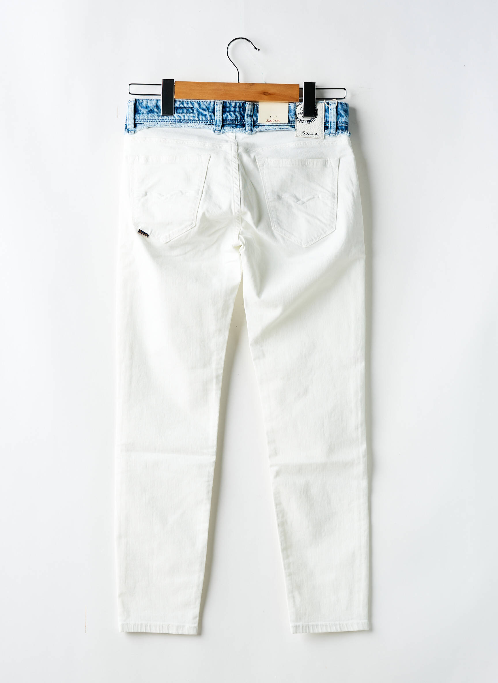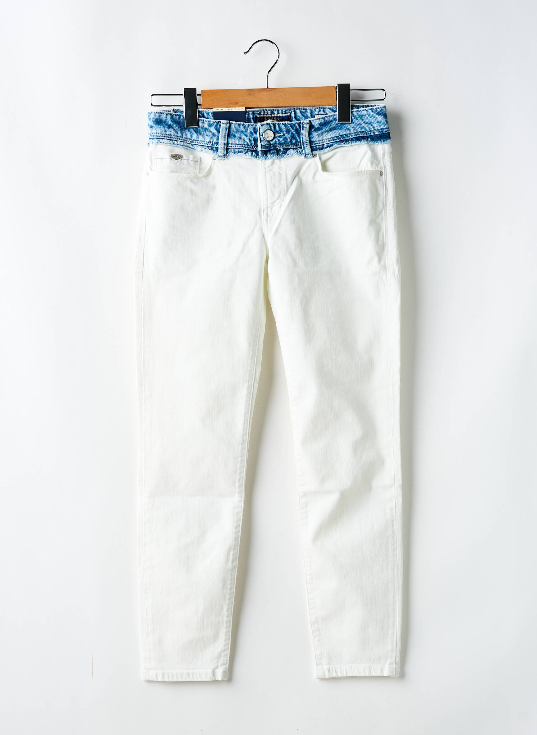 Craquez pour ce jeans coupe slim pour femme signé SALSA, une véritable bonne affaire pour celles qui veulent allier style tendance et petits prix. Sa teinte blanche éclatante rehaussée d’une ceinture effet denim bleu apporte une note originale et moderne à votre look, tout en mettant en valeur votre silhouette grâce à sa coupe ajustée. Profitez d’un modèle à la fois chic et facile à assortir, parfait pour composer des tenues actuelles sans vous ruiner.