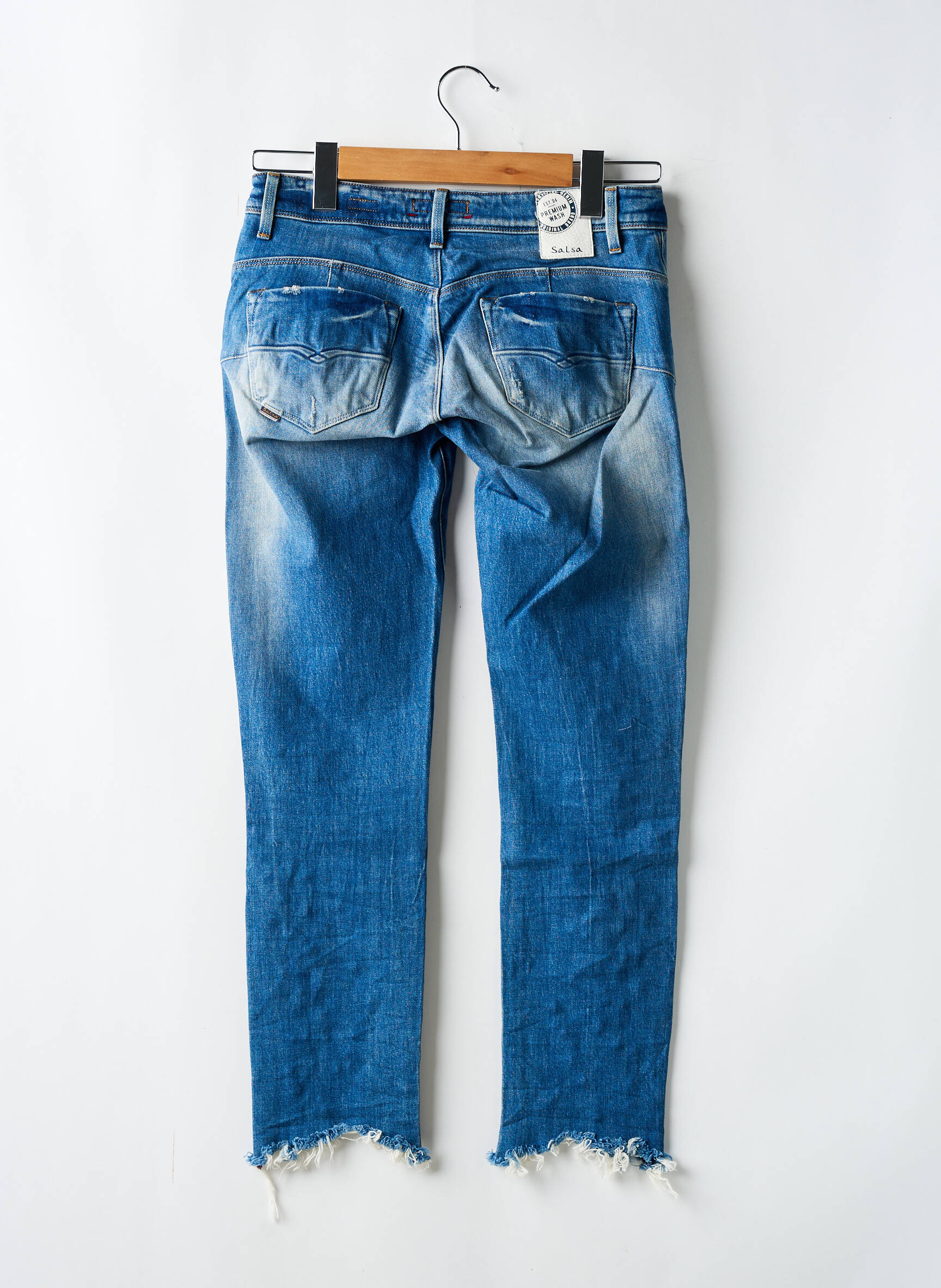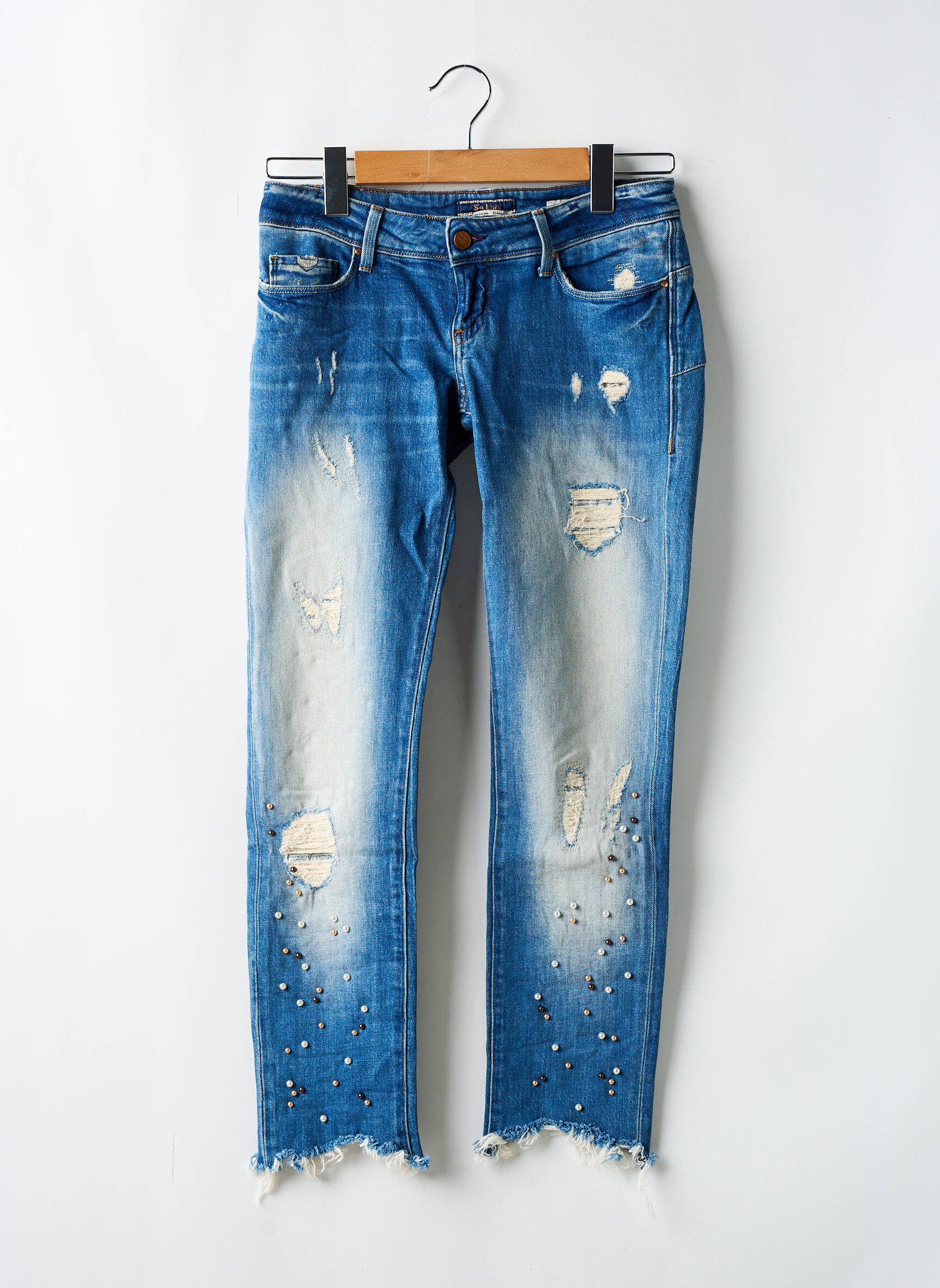 Profitez d’une offre irrésistible avec ce jeans coupe slim de la marque SALSA pour femme, idéal pour donner du caractère à vos tenues sans vous ruiner. Son effet usé très tendance, rehaussé de détails déchirés et de petites perles fantaisie, apporte une touche moderne et décontractée à votre look. La coupe slim épouse parfaitement la silhouette, tandis que les bas effilochés ajoutent une note rebelle ultra mode. C’est le bon plan parfait pour celles qui veulent s’offrir une pièce stylée à prix malin.
