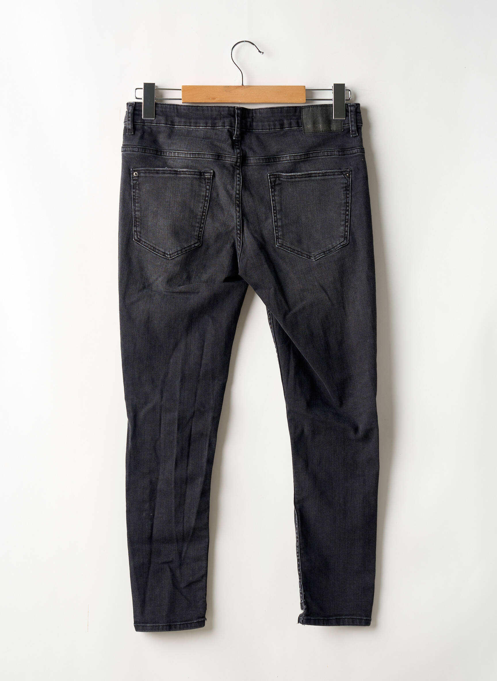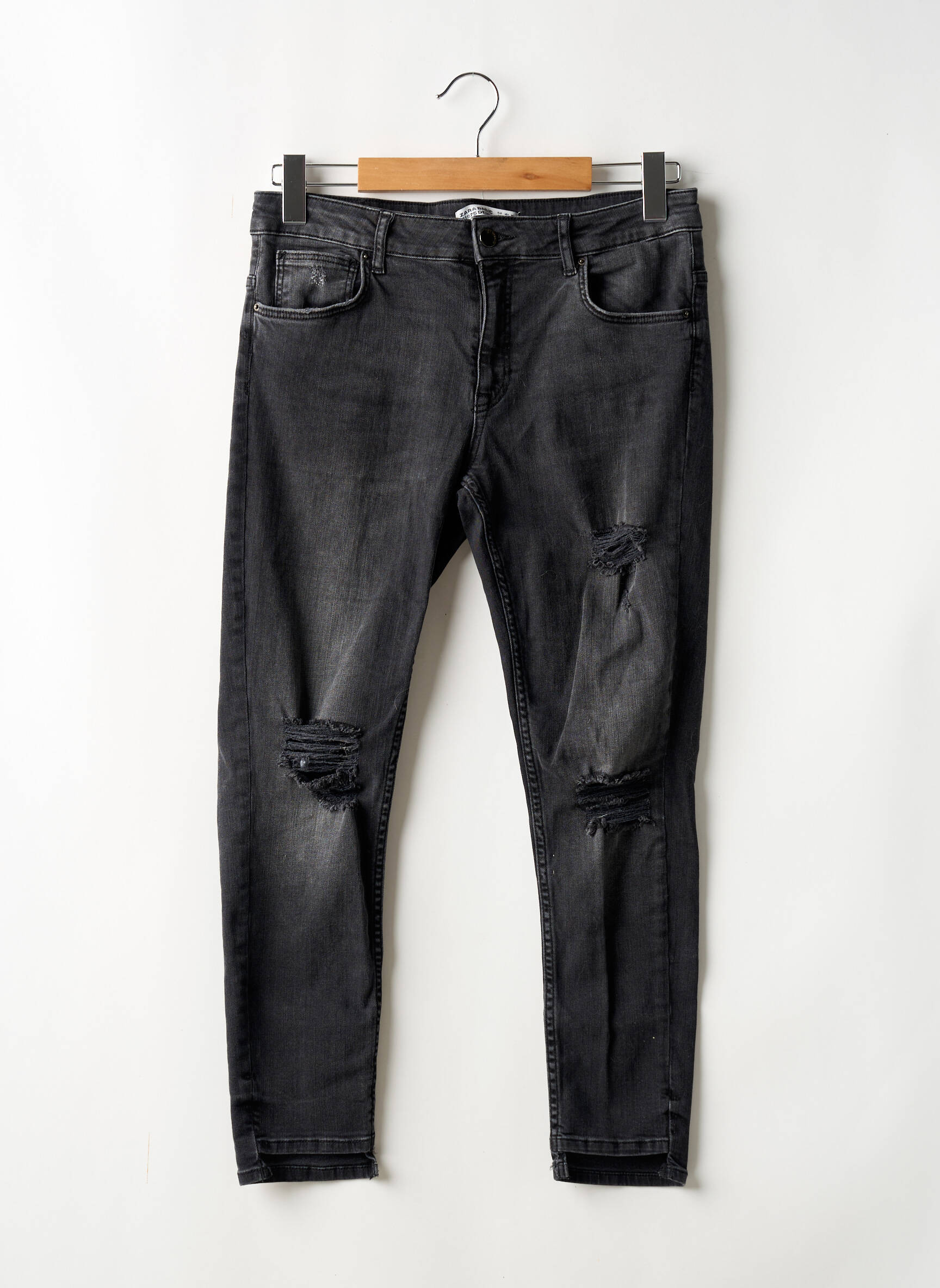 Profitez d’un look tendance à petit prix avec ce jeans coupe slim pour femme de la marque ZARA, parfait pour celles qui veulent allier style et économies. Ce modèle présente une finition noir grisé légèrement délavée avec des effets usés et des déchirures élégamment placées sur les jambes, offrant un style urbain très actuel idéal pour renouveler votre garde-robe sans vous ruiner.