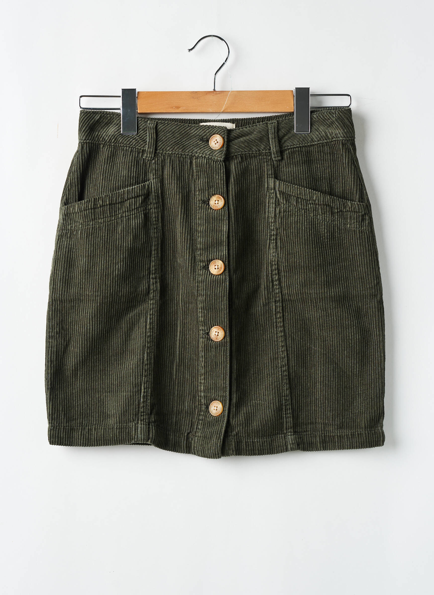 Profitez d’un vrai bon plan avec cette jupe courte LOLA ESPELETA, idéale pour donner du style à petit prix à votre dressing. Sa coupe droite met en valeur la silhouette, tandis que son joli tissu vert kaki façon velours côtelé apporte une touche à la fois tendance et décontractée. Sa rangée de boutons contrastés sur le devant et ses grandes poches accentuent son allure rétro et moderne, parfait pour dynamiser une tenue tout en maîtrisant votre budget.