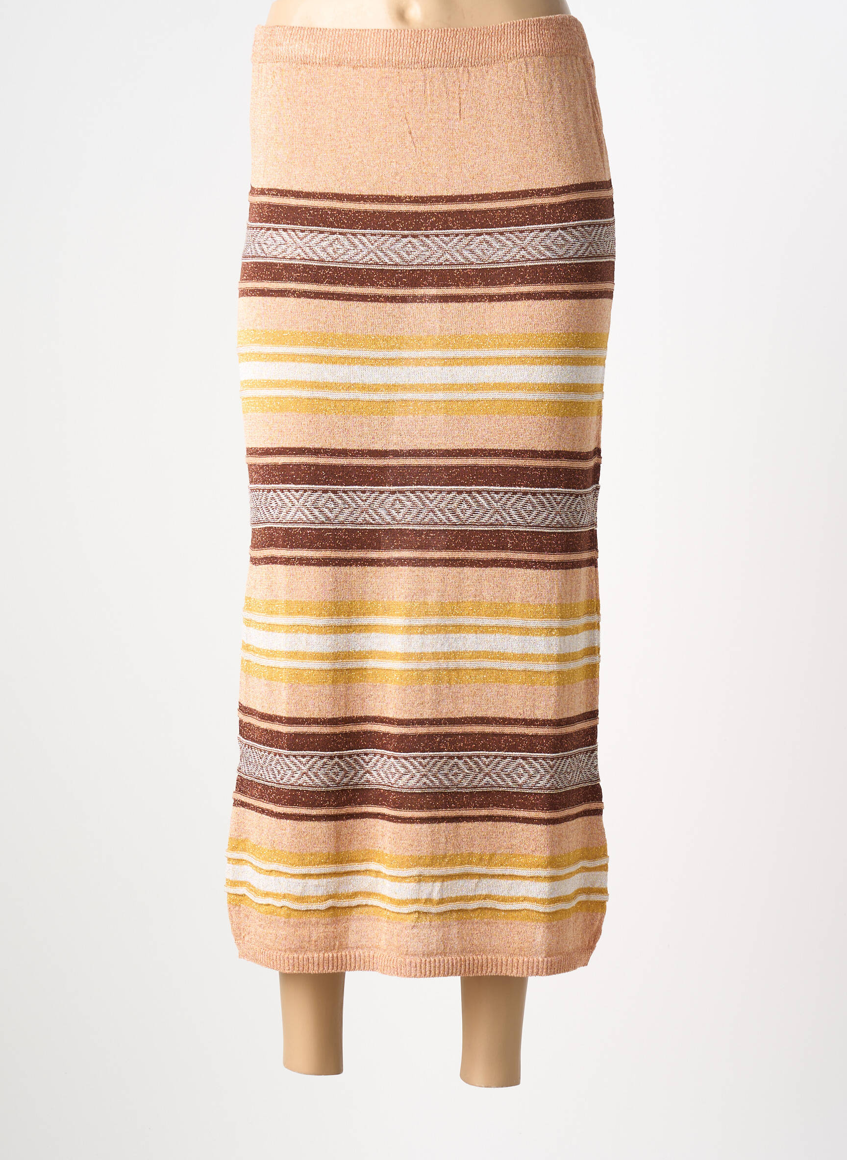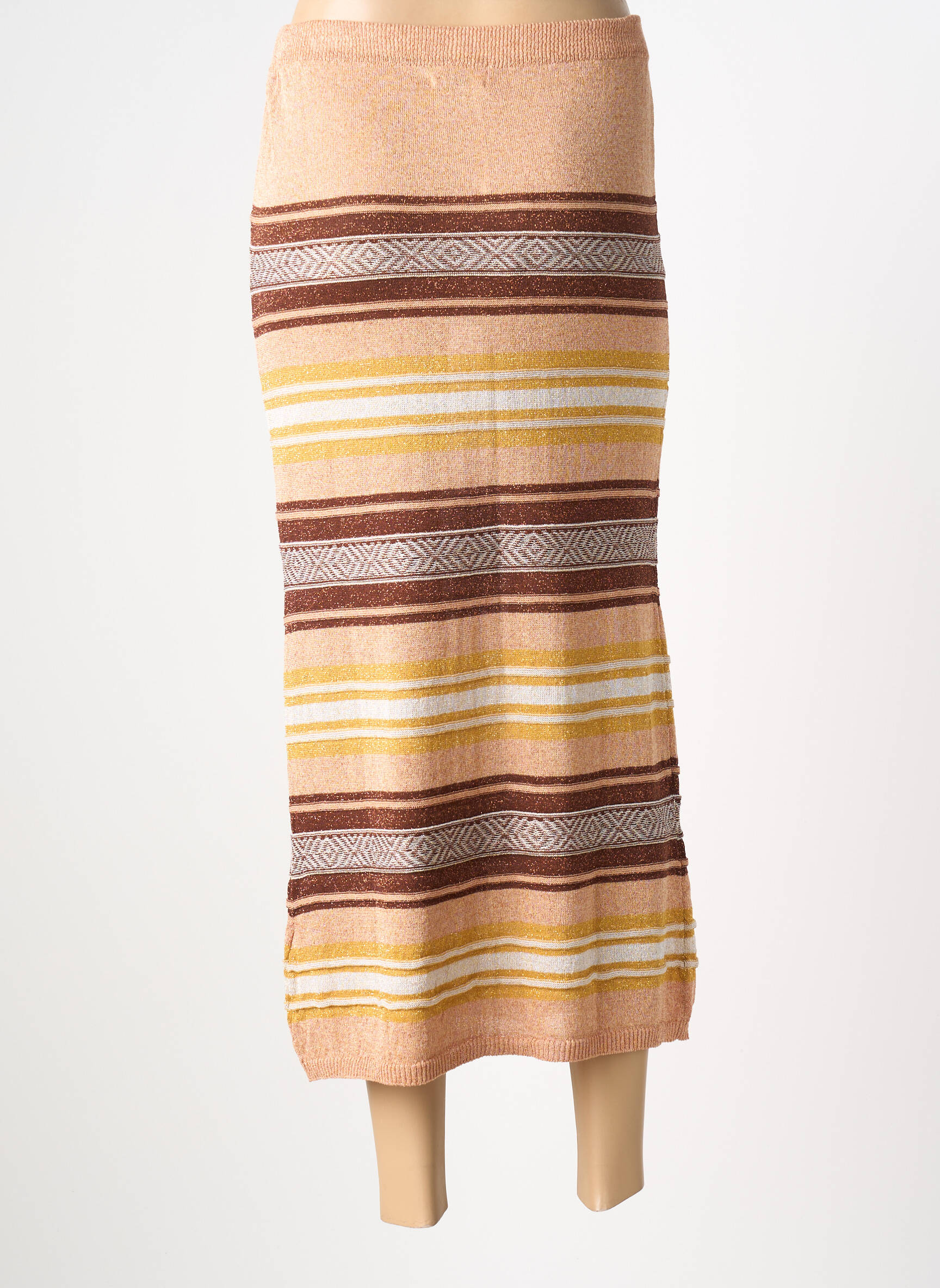 Profitez d’un bon plan mode avec cette jupe longue B.YU pour femme, un véritable coup de cœur à petit prix. Sa coupe droite et sa longueur élégante sont sublimées par un jeu de rayures horizontales dans des tonalités chaudes de beige, marron et jaune, rehaussées de motifs géométriques raffinés qui apportent une touche d’originalité à votre silhouette. Cette jupe facile à assortir s’adapte aussi bien aux looks casual qu’aux styles plus sophistiqués et vous offre un style unique à prix doux, parfait pour renouveler votre dressing sans vous ruiner.