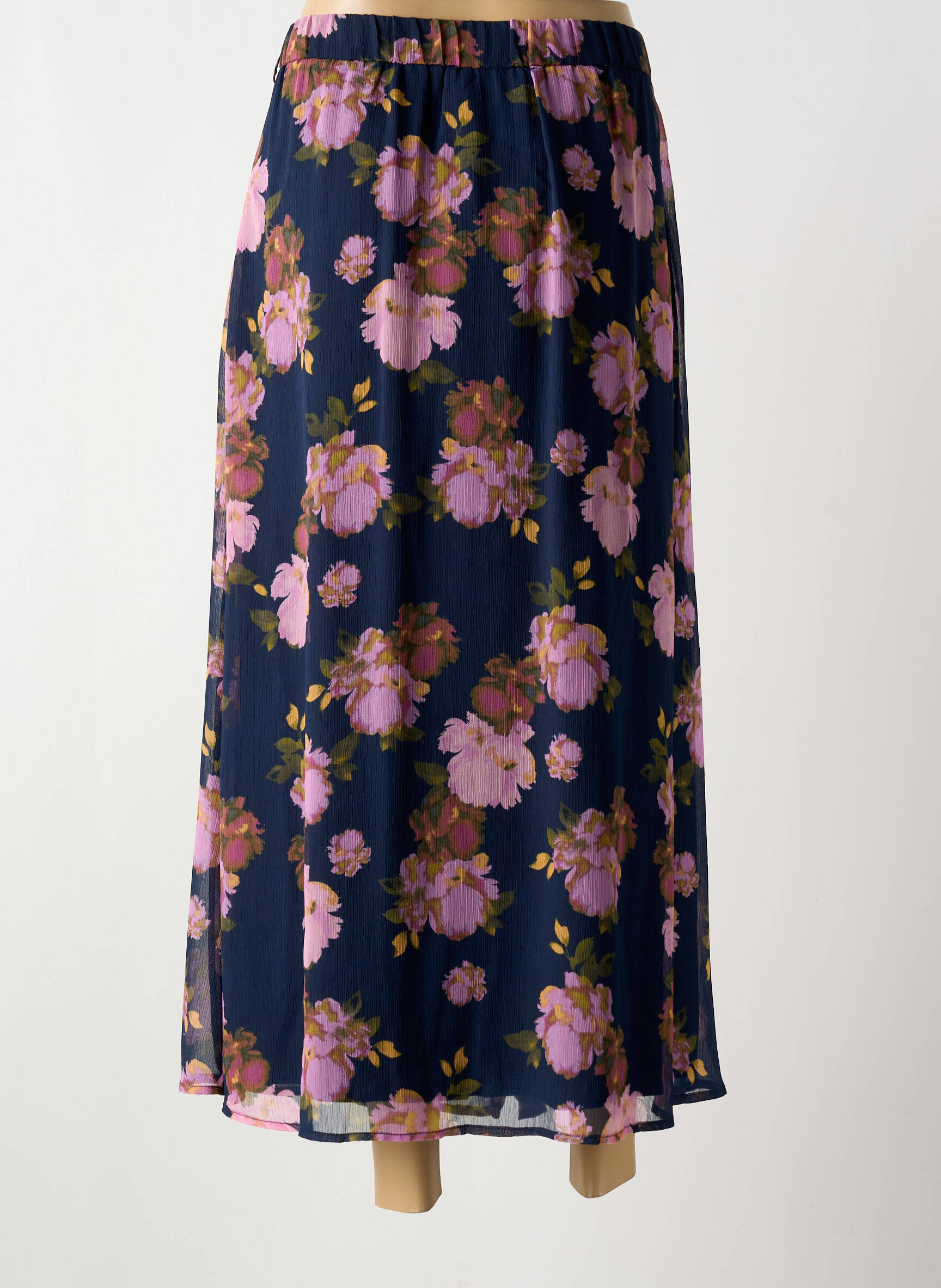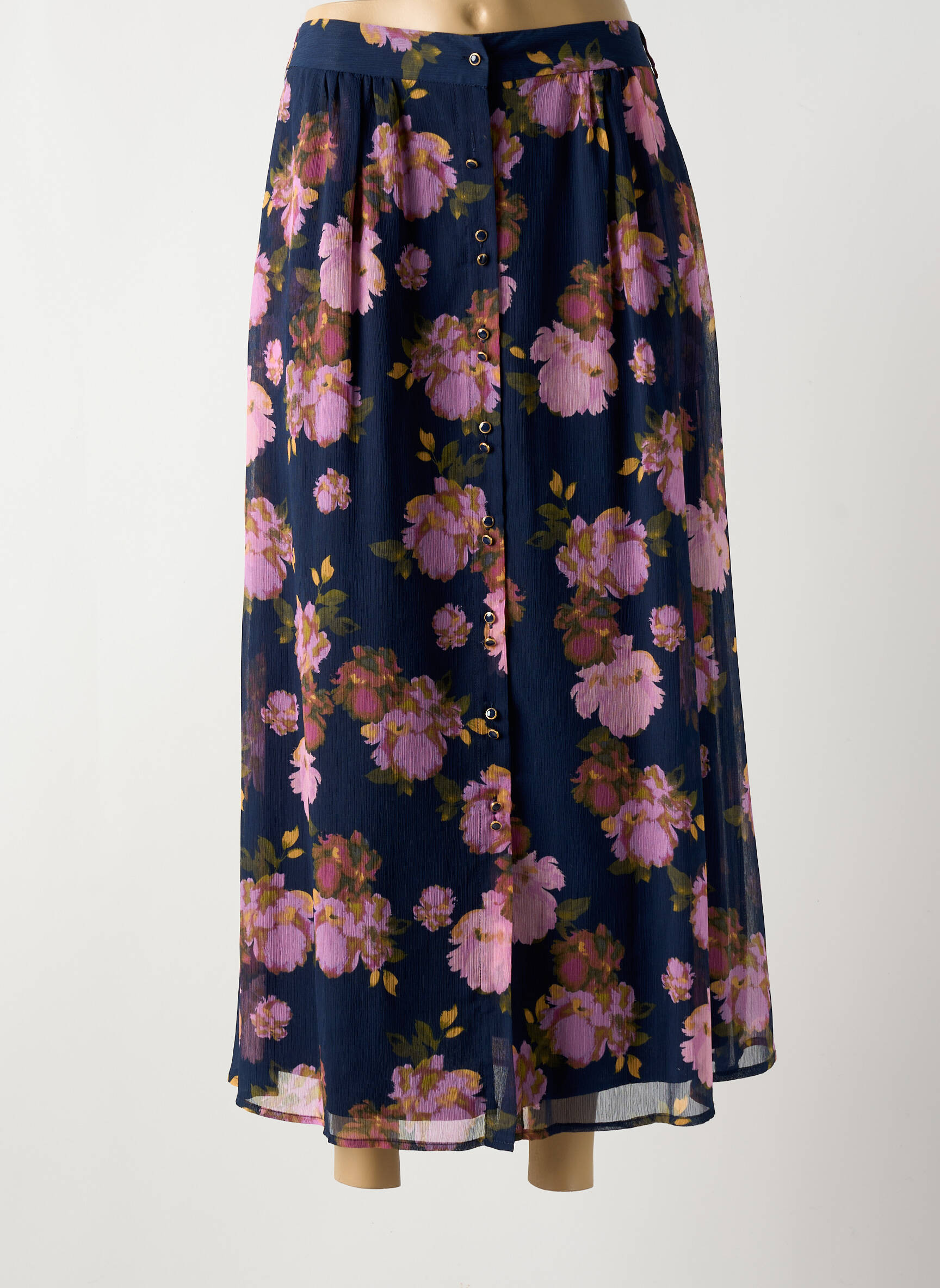 Profitez d'une véritable affaire mode avec cette jupe longue de la marque LA PETITE ETOILE, proposée à prix tout doux. Son tissu fluide laisse apparaître un élégant motif fleuri dans des tons roses et violets sur fond bleu marine, et la coupe légèrement évasée avec boutonnage sur le devant lui confère une allure féminine et tendance, parfaite pour dynamiser votre dressing sans vous ruiner.