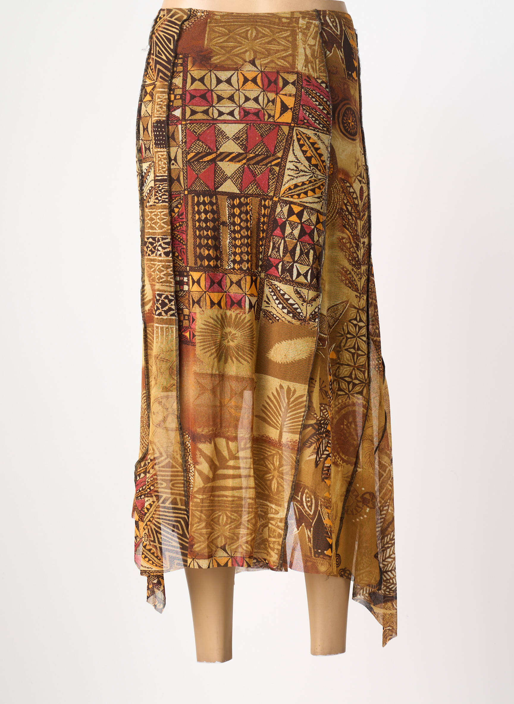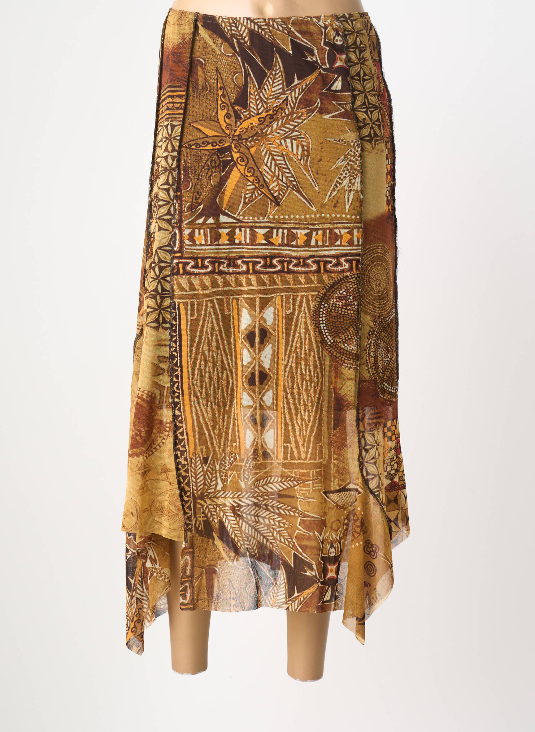 Profitez d'une véritable affaire avec cette jupe longue signée PIER BÉ, idéale pour apporter une touche d’originalité à vos looks d’été sans vous ruiner. Ce modèle affiche un magnifique imprimé ethnique aux nuances dorées et brunes, souligné par des motifs graphiques et floraux qui égayent la silhouette en toute légèreté. Sa coupe fluide et légèrement asymétrique offre un tombé élégant, parfait aussi bien pour une journée détente qu’une soirée estivale. C’est le choix idéal pour renouveler votre dressing à petit prix tout en misant sur un style unique et raffiné.
