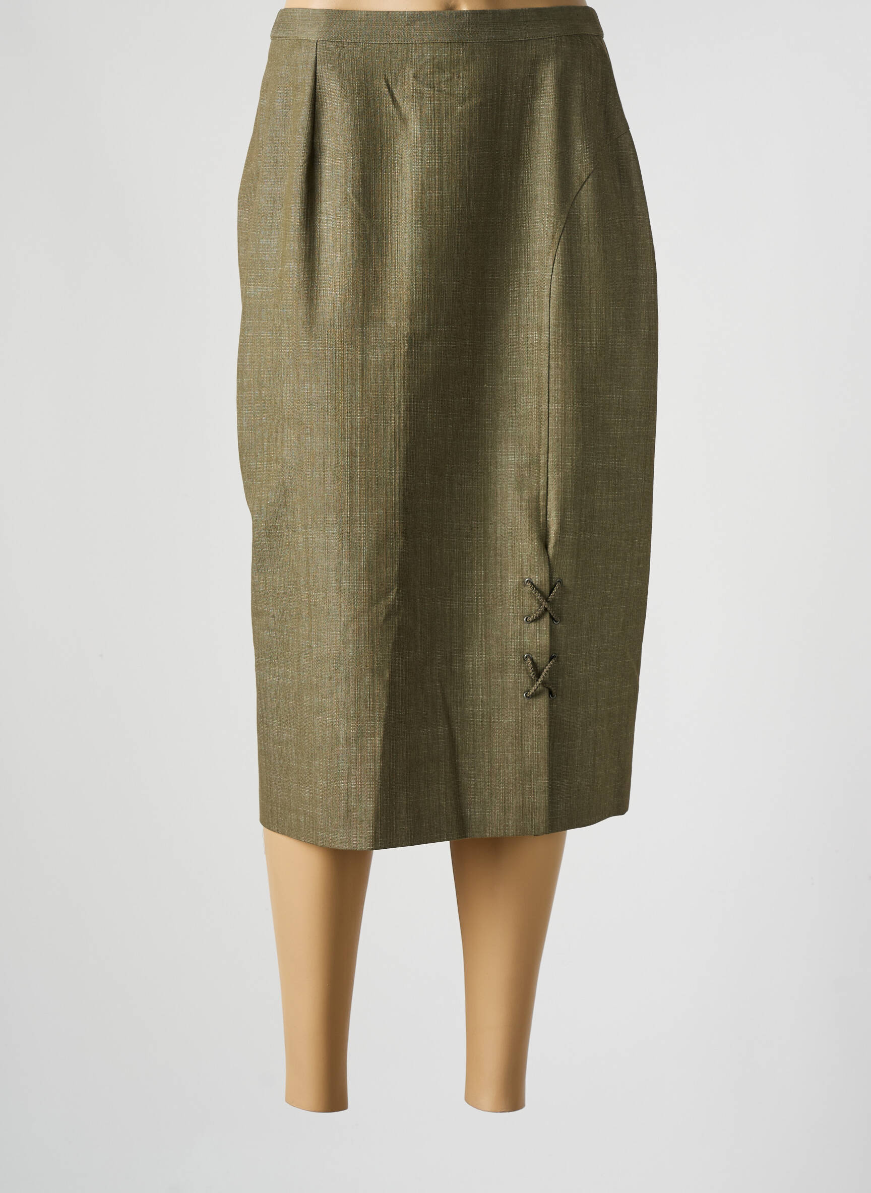 Profitez d’un bon plan en ajoutant cette jupe mi-longue de la marque FRANCE RIVOIRE à votre dressing, une pièce élégante à petit prix qui séduit par sa coupe droite flatteuse et son tissu à l’aspect légèrement chiné, rehaussée de plis discrets à la taille et d’un détail original de petits nœuds cousus sur le bas, parfait pour une allure soignée en toute simplicité.