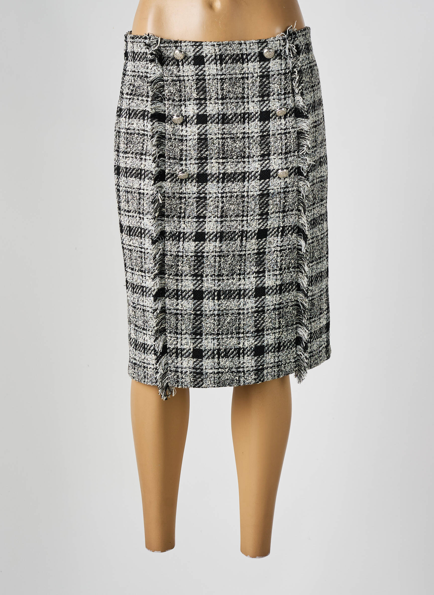 Profitez d’un véritable bon plan avec cette jupe mi-longue MERI & ESCA pour femme, parfaite pour apporter une touche élégante à votre garde-robe sans vous ruiner. Son tissu à motif pied-de-poule noir et blanc et sa coupe droite offrent un look classique revisité, tandis que les boutons décoratifs et les bords frangés ajoutent une note tendance tout en simplicité. C’est l’occasion idéale de vous offrir une pièce chic et actuelle à petit prix.