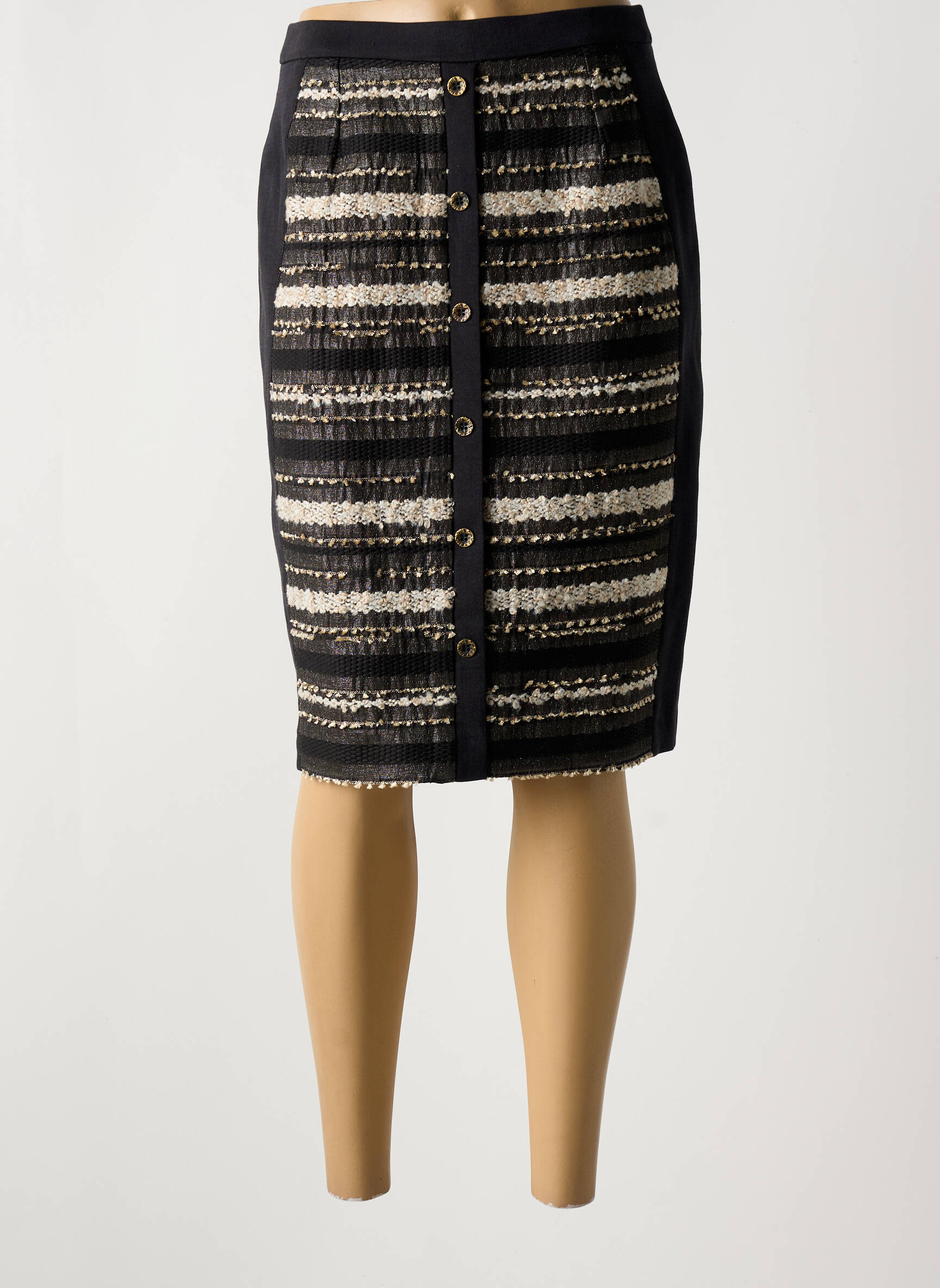 Profitez d'une pièce tendance à prix malin avec cette jupe mi-longue signée MERI & ESCA, parfaite pour celles qui aiment allier élégance et économies. Son design chic mêle des rayures horizontales délicatement texturées à des boutons métalliques sur le devant, tandis que sa coupe près du corps met en valeur la silhouette en toute simplicité. Un vrai bon plan pour renouveler votre garde-robe sans exploser votre budget.