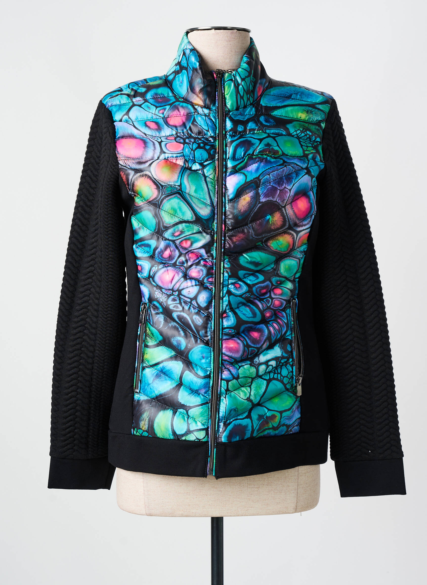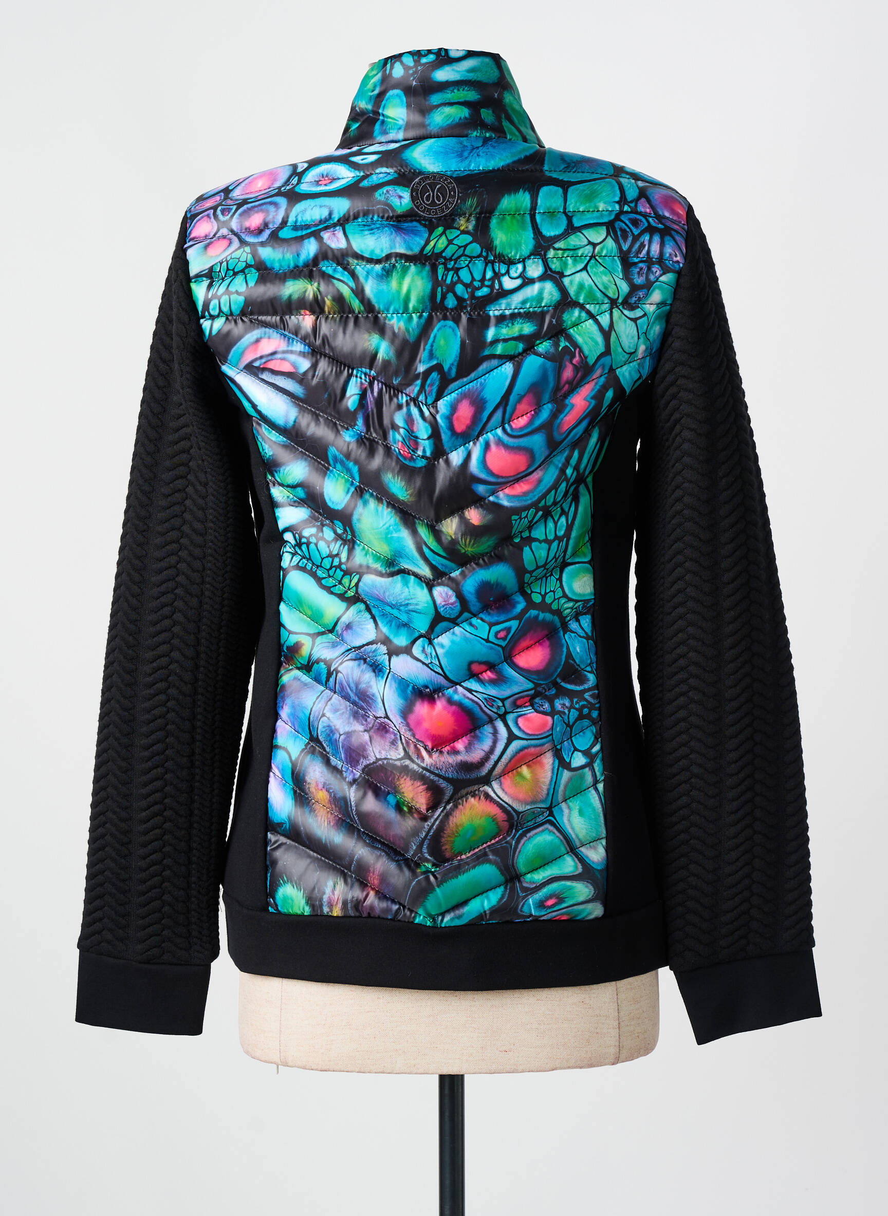 Imaginez emporter avec vous un kaléidoscope de couleurs où que vous alliez : ce doudoune pour femme signée DOLCEZZA marie avec audace un corps matelassé au motif éclatant rappelant les écailles d’un reptile multicolore, tandis que ses manches noires texturées apportent une élégance subtile et une chaleur enveloppante grâce à leur toucher structuré, pour un équilibre parfait entre originalité et confort au quotidien.