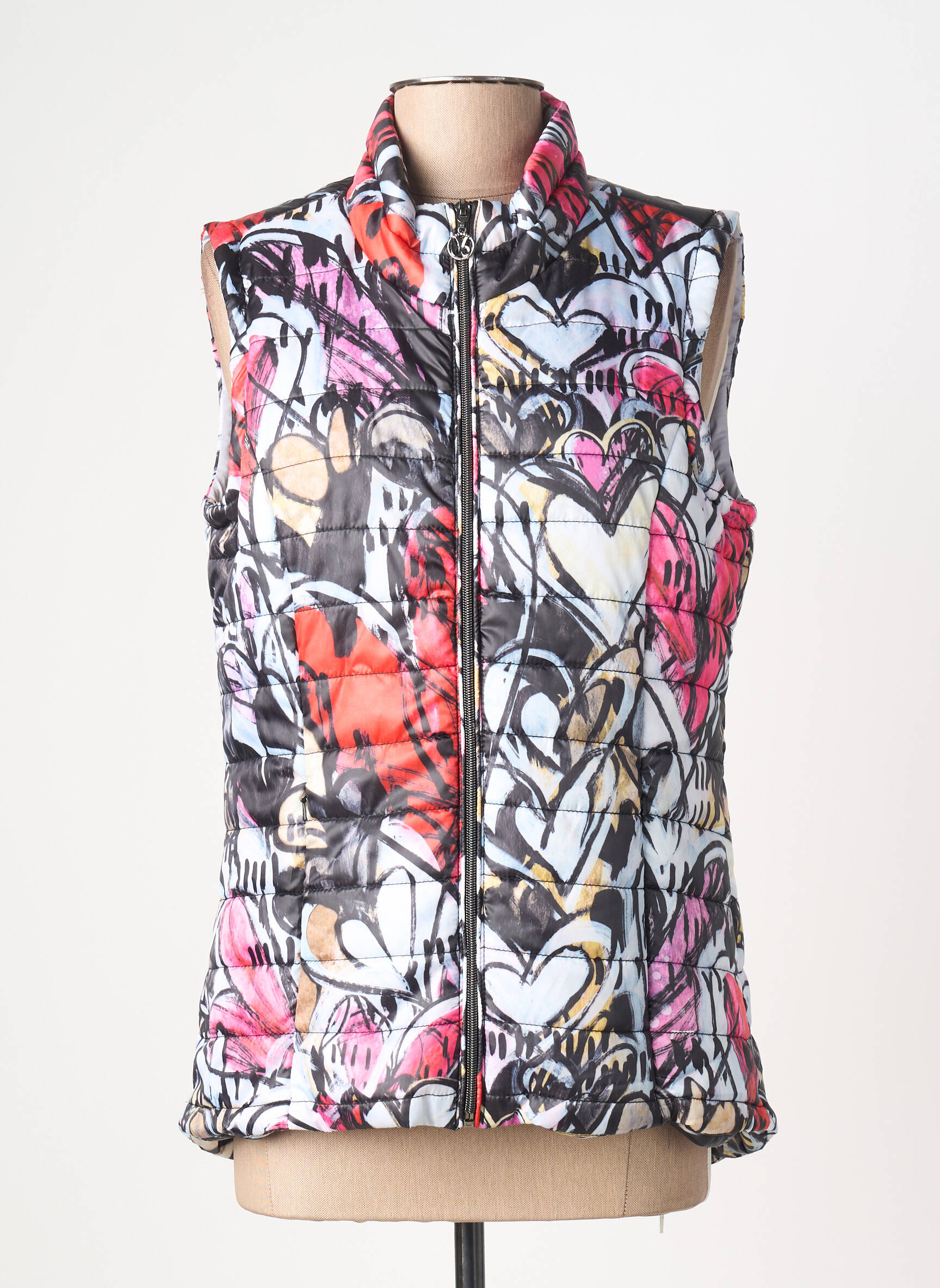 Offrez-vous une touche d’originalité à prix malin avec cette doudoune sans manches pour femme de la marque DOLCEZZA, qui se démarque par son motif graphique multicolore audacieux mêlant des cœurs stylisés et des touches de couleur vibrantes sur fond blanc et noir, tout en vous assurant un look tendance et actuel sans vous ruiner grâce à ce bon plan exclusif déstockage.
