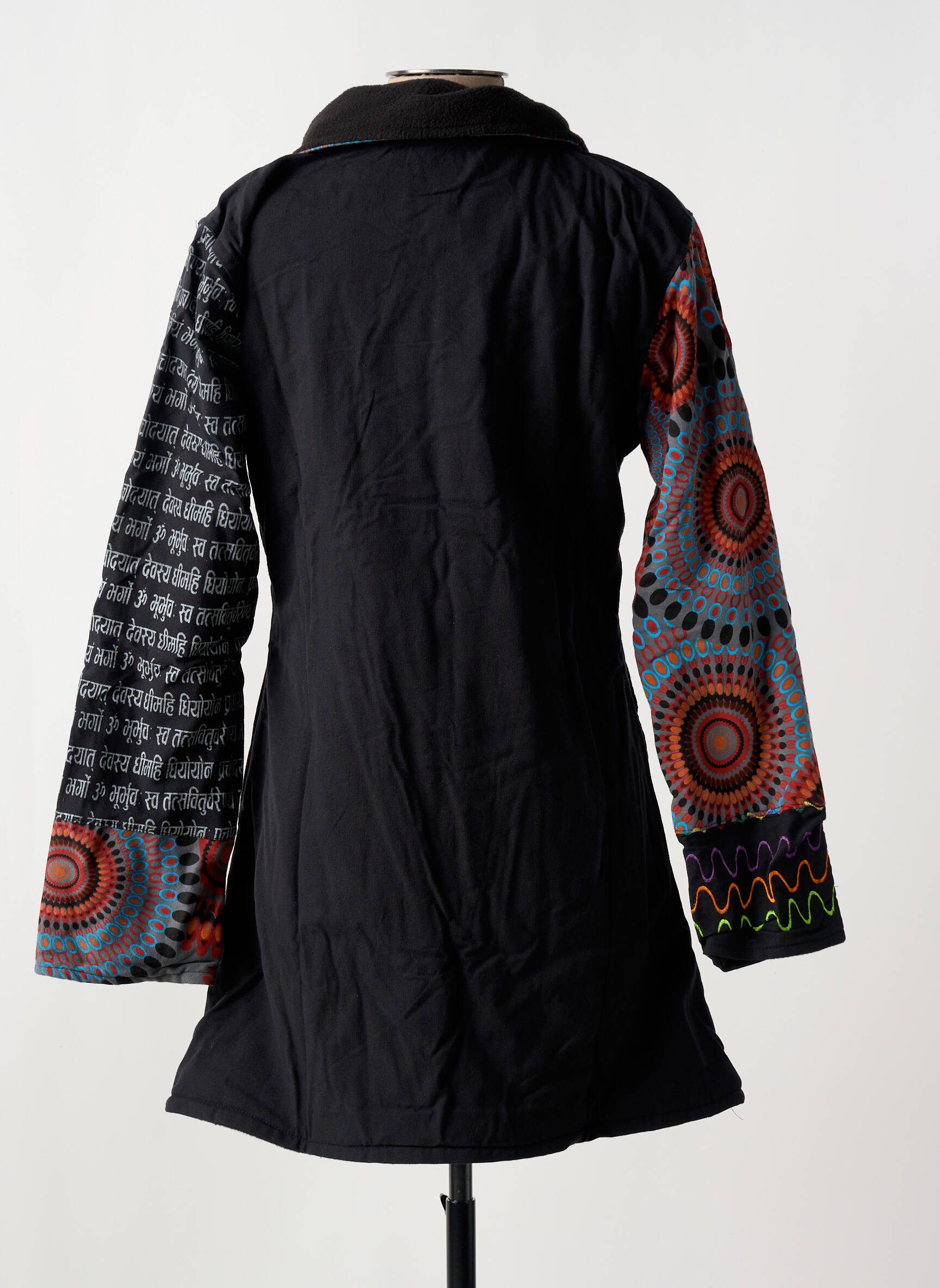 Pour mettre en valeur ce manteau original, il suffit de l’enfiler sur un jean slim ou un pantalon uni pour garder l’attention sur ses motifs vibrants. Tu peux l’associer à un pull col roulé sobre et à une paire de bottines noires ou marron pour équilibrer la tenue tout en restant dans l’esprit casual chic. Accessoirise-le avec un sac à main discret et évite les imprimés sur les autres pièces afin de laisser au manteau toute sa place.