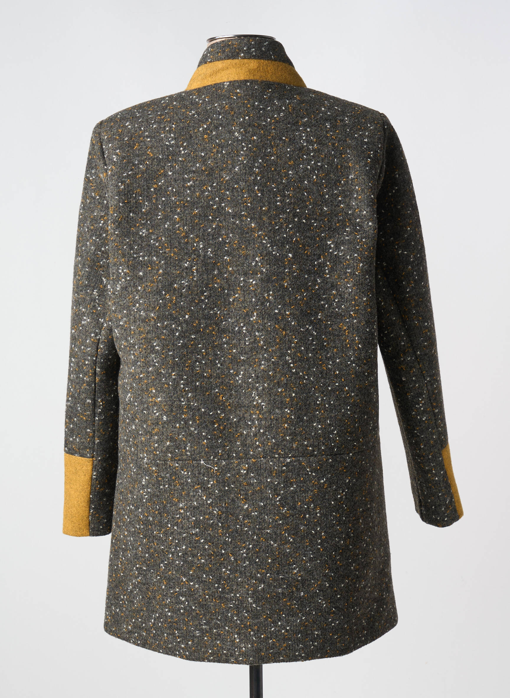 Ce manteau se porte facilement avec un jean brut et un pull uni pour un look décontracté, ou avec une robe droite et des bottines pour une allure plus féminine. Les touches de couleur permettent d’oser des accessoires assortis comme un sac ou une écharpe dans les mêmes tons moutarde, pour souligner subtilement l’originalité de la coupe.
