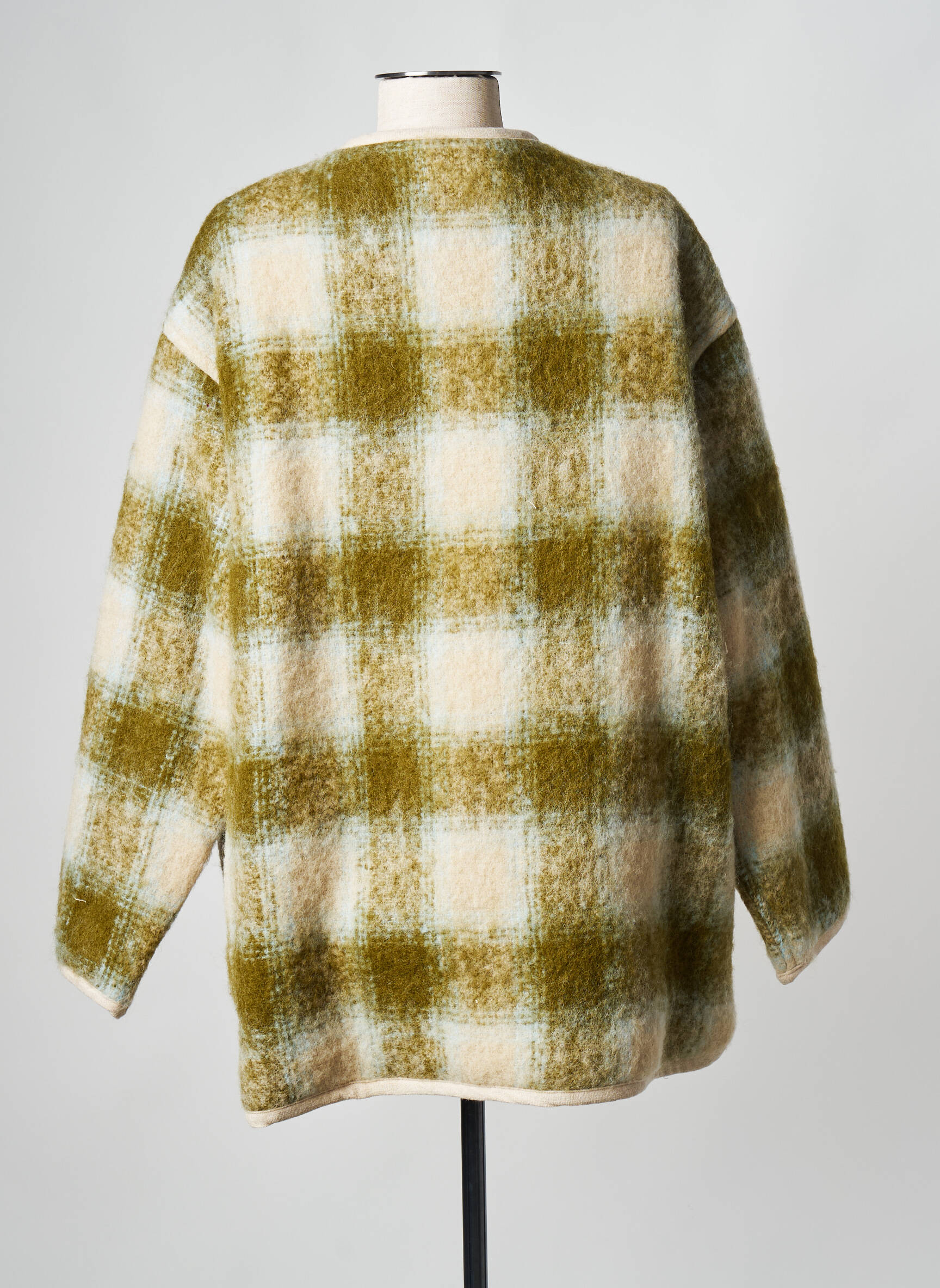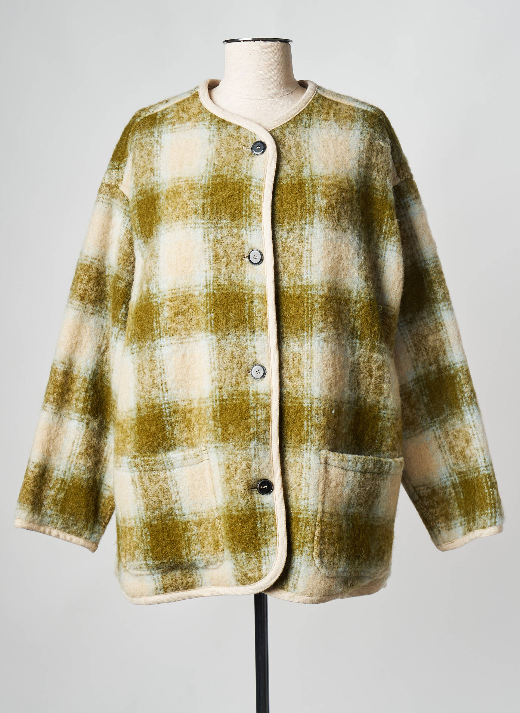 Saisissez l’opportunité de faire une belle économie avec ce manteau court Pomandère pour femme, une pièce tendance à prix tout doux, idéale pour celles qui aiment dénicher les meilleures affaires mode. Son motif à larges carreaux dans des tons doux de vert mousse et de beige lui donne une touche vintage raffinée, tandis que sa coupe droite légèrement oversize assure un confort décontracté et très actuel. Les finitions contrastées le long de l’encolure ronde et de la patte de boutonnage ajoutent une note sophistiquée, et ses deux poches plaquées à l’avant sont aussi pratiques qu’élégantes. Voilà le manteau parfait pour booster vos looks citadins, sans vous ruiner.