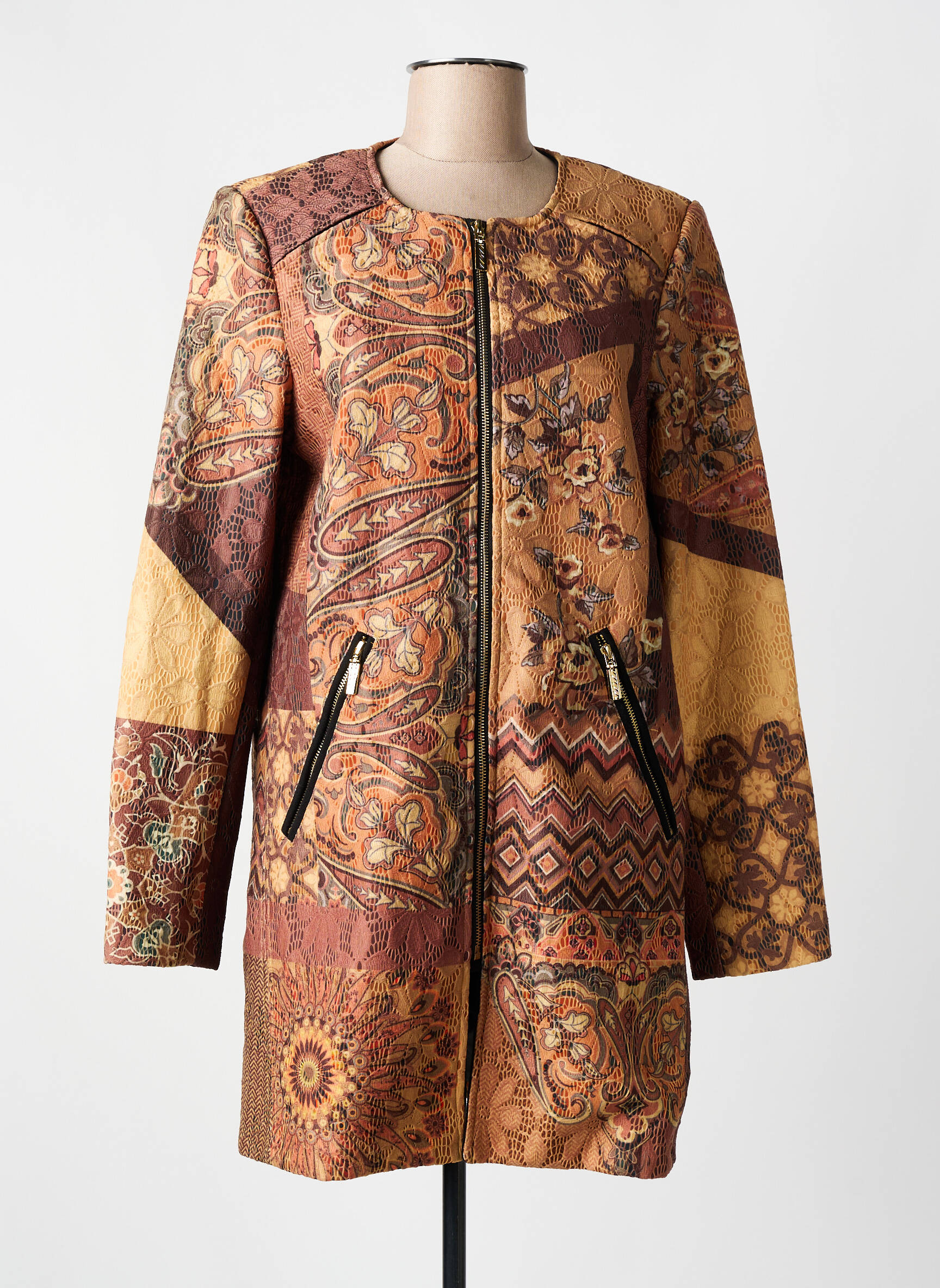 Profitez d’un véritable bon plan mode avec ce manteau long pour femme de la marque 101 Idées, une pièce originale à prix mini qui ne passe pas inaperçue. Sa coupe droite et élégante met en valeur un superbe patchwork de motifs ethniques et floraux dans des tons chauds, idéale pour donner du caractère à tous vos looks d’automne ou d’hiver. La fermeture zippée et les deux poches zippées apportent une touche moderne et pratique, tandis que le tissu travaillé et les détails de surpiqûres assurent un style unique sans vous ruiner.