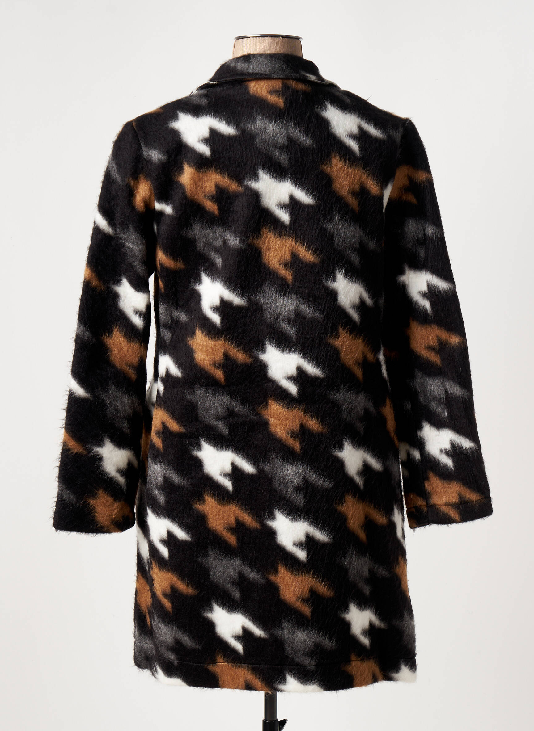 Ce manteau se prête parfaitement à un look citadin chic en l’enfilant sur un pull uni et un pantalon noir, pour un effet sophistiqué sans effort. Il s’accorde aussi volontiers avec une robe fluide et des bottines pour une silhouette élégante en journée comme en soirée. Pour une touche moderne, n’hésitez pas à opter pour des accessoires sobres, comme une écharpe camel et un sac en cuir noir, afin de mettre en valeur son motif graphique tout en restant dans un esprit bon plan.