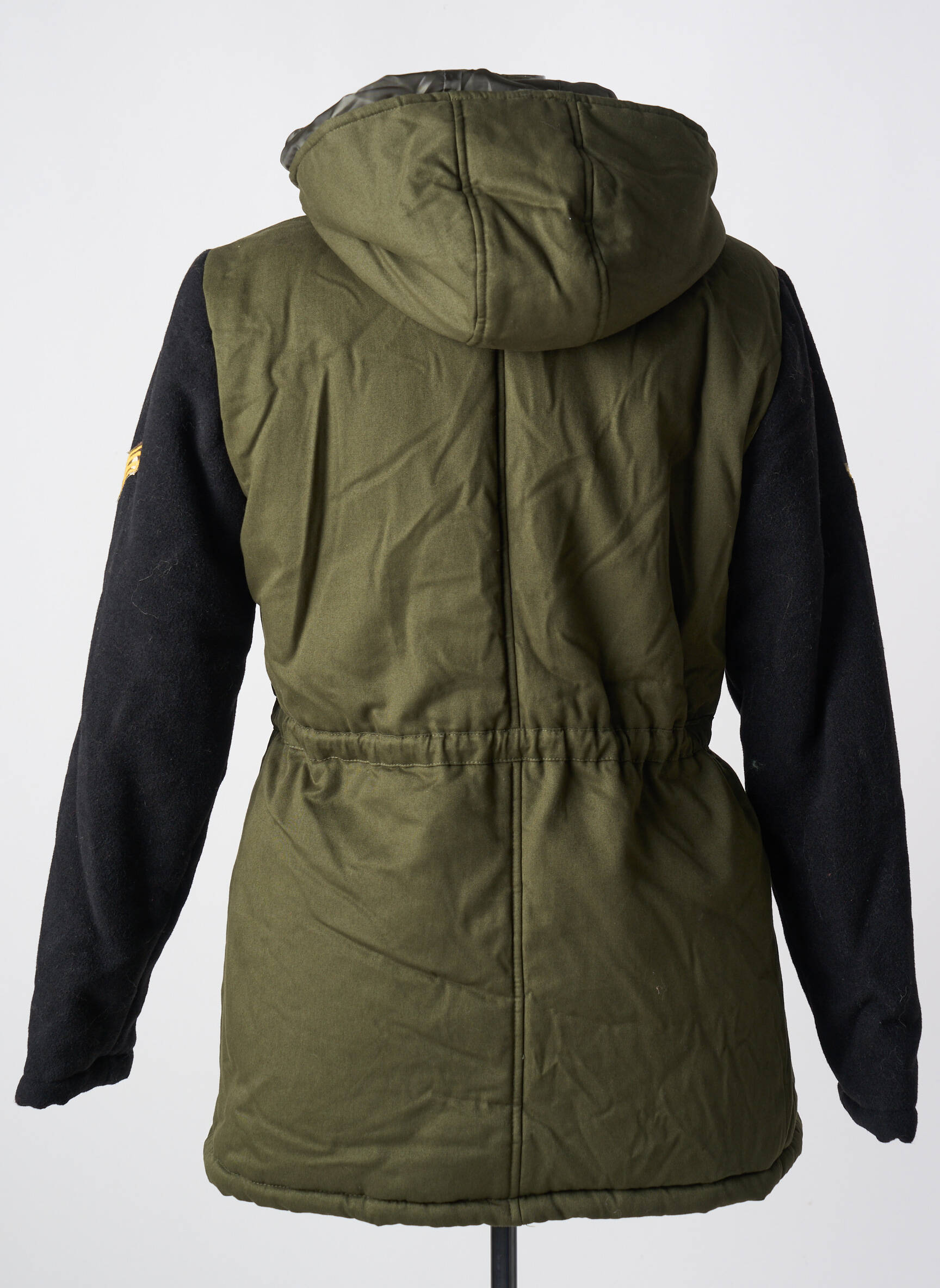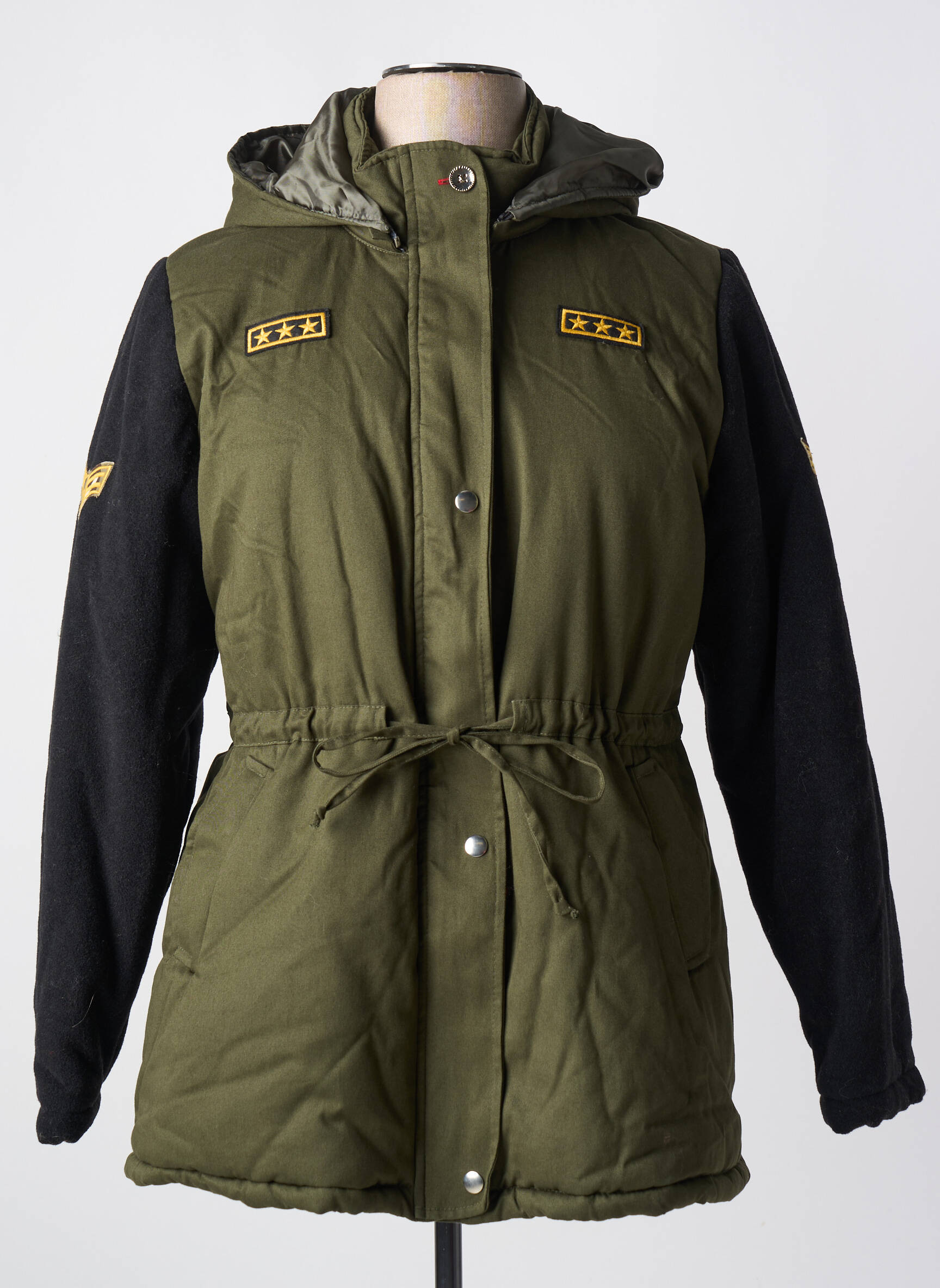 Quand l'esprit urbain rencontre une allure militaire revisité, ce parka MERI & ESCA pour femme impose son style unique avec audace. Sa coupe cintrée est raffinée par un cordon de serrage à la taille qui sublime la silhouette tout en offrant confort et ajustement personnalisé. Le vert kaki profond du corps s’harmonise parfaitement avec les manches noires qui apportent une touche contrastée moderne, tandis que la capuche soigneusement intégrée protège des intempéries sans sacrifier l’esthétique. Les petits écussons brodés sur le devant et sur les manches ajoutent un détail graphique qui fait toute la différence, offrant à cette pièce un charme résolument contemporain et décontracté. Pratique et élégante, cette parka est un choix parfait pour affronter la saison avec assurance et caractère.