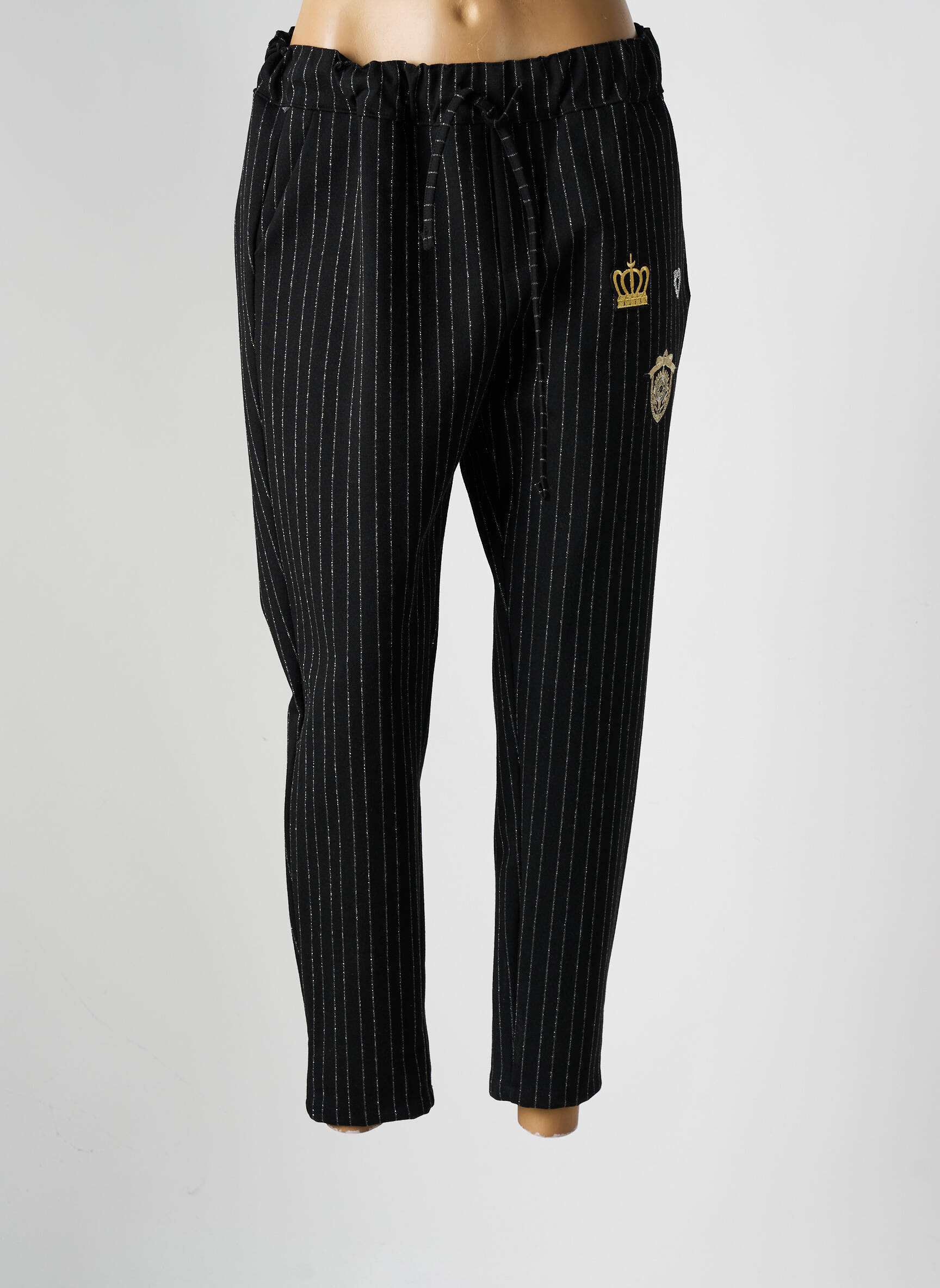 Craquez pour ce jogging femme de la marque LACOMY, parfait pour conjuguer confort et style sans se ruiner grâce à notre offre exceptionnelle. Avec son motif à fines rayures verticales et ses jolis écussons dorés esprit royal sur la hanche, il affirme une touche d’originalité tout en restant facile à porter au quotidien. Sa taille élastiquée avec un cordon de serrage garantit un ajustement optimal et un maintien agréable, faisant de ce pantalon un excellent choix pour toutes vos envies sport ou détente à prix mini.