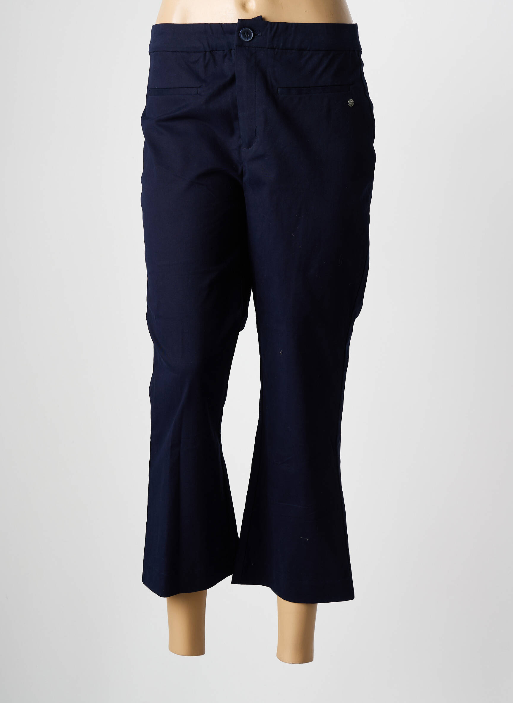 Pour sublimer ce pantacourt, il suffit d’opter pour un top coloré, une blouse légère ou un t-shirt graphique qui tranchera joliment avec la teinte marine. Vous pouvez compléter la tenue avec une paire de baskets pour une allure citadine ou choisir des sandales plates pour une touche estivale. Un petit sac bandoulière ainsi qu’une veste en jean ou un gilet fluide viendront parfaire l’ensemble, créant une silhouette actuelle et facile à porter en toutes circonstances.