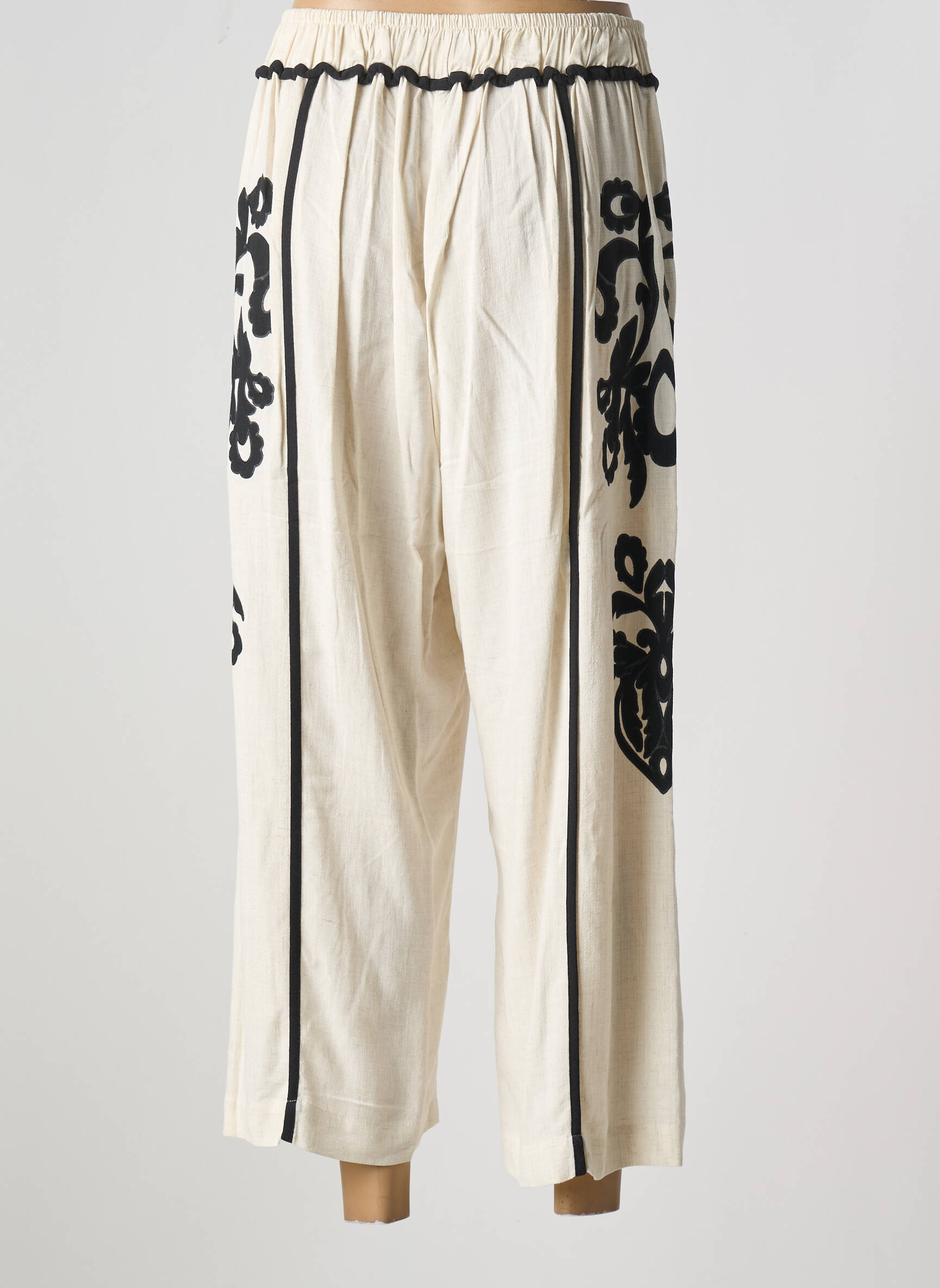Profitez d’un bon plan mode avec ce pantalon 7/8 de la marque MAT., parfait pour donner une touche élégante et moderne à votre garde-robe sans vous ruiner. Sa coupe ample et sa teinte claire sont mises en valeur par de fines bordures contrastantes, tandis que les détails imprimés sur le côté apportent une note graphique contemporaine. Idéal pour celles qui recherchent un look raffiné à petit prix, ce pantalon combine confort et style pour un effet chic en toutes circonstances.