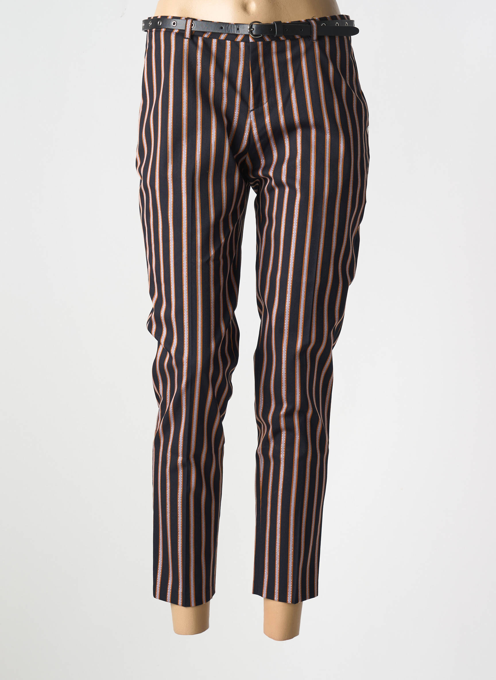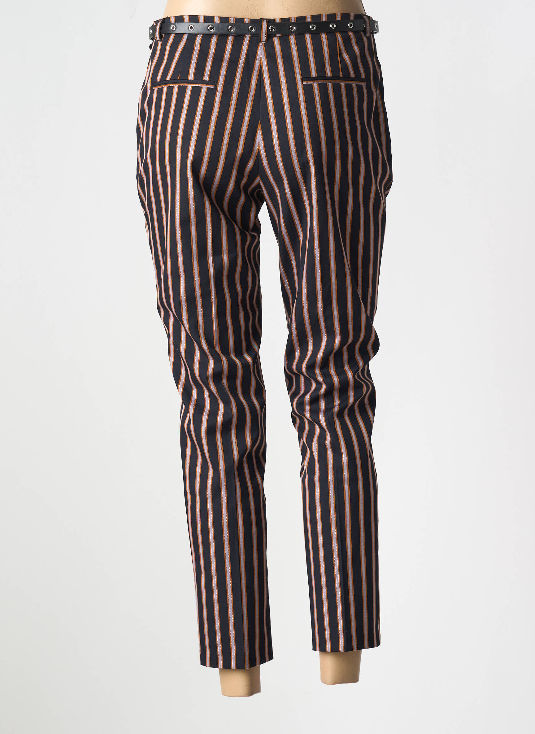 Pour créer un look tendance avec ce pantalon, il suffit de l’associer à un t-shirt blanc ou une blouse fluide pour adoucir l’effet graphique des rayures. Les baskets blanches ou des mocassins complèteront parfaitement l'ensemble pour un style décontracté, tandis qu’une paire d’escarpins apportera une touche plus habillée. Un blazer uni rehaussera facilement la silhouette, et un petit sac en bandoulière ajoutera la note finale idéale à votre tenue.